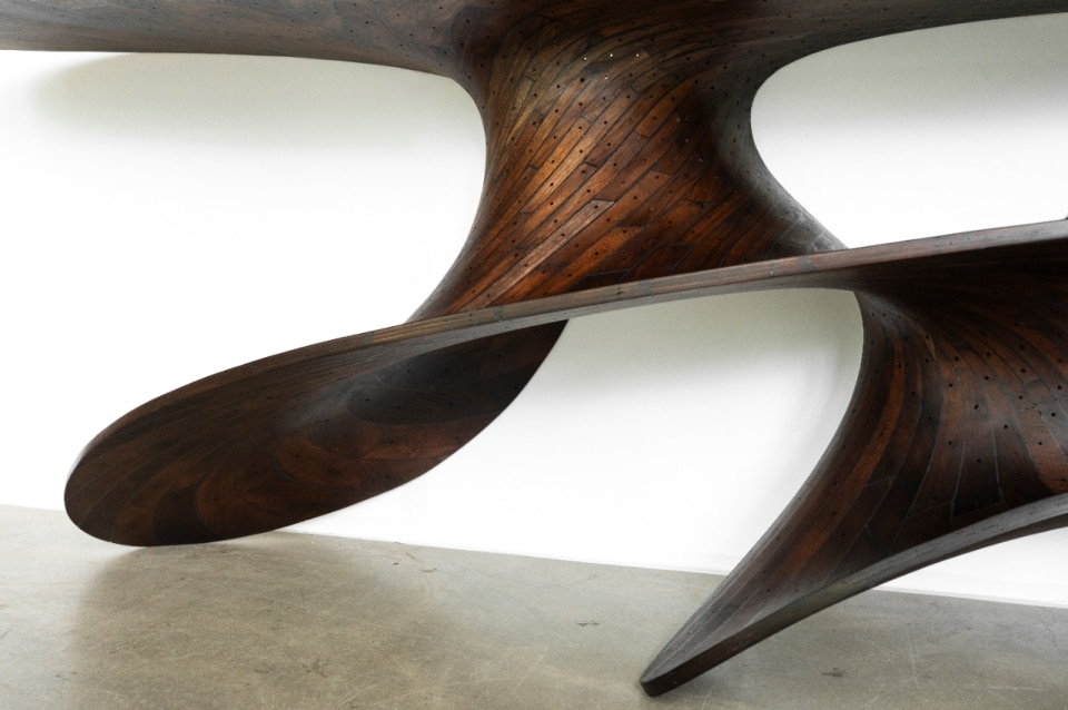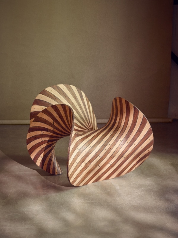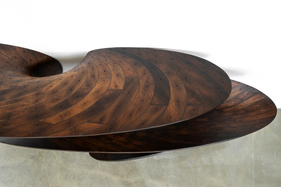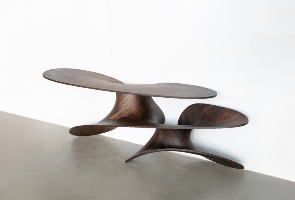 The Ply Loop Chair is another fundamental piece in the studio’s trajectory: a continuous spiral in oak and walnut, held together by a bio-resin developed with Plantics, a 100% bio-based thermosetting resin that is fully biodegradable and infinitely recyclable. It is an object that seems to come from a physics laboratory rather than a carpentry workshop, yet it emerges directly from the logic of the material itself. And then there is the digital vertigo of the Voxel Tables (2023): pixelated architectures built voxel by voxel, as if furniture had passed through a 1990s video game before returning to the physical world. The table, made of resin and neodymium (chemical element, atomic number 60), is a surface oscillating between baroque ornament and extreme computational modelling.