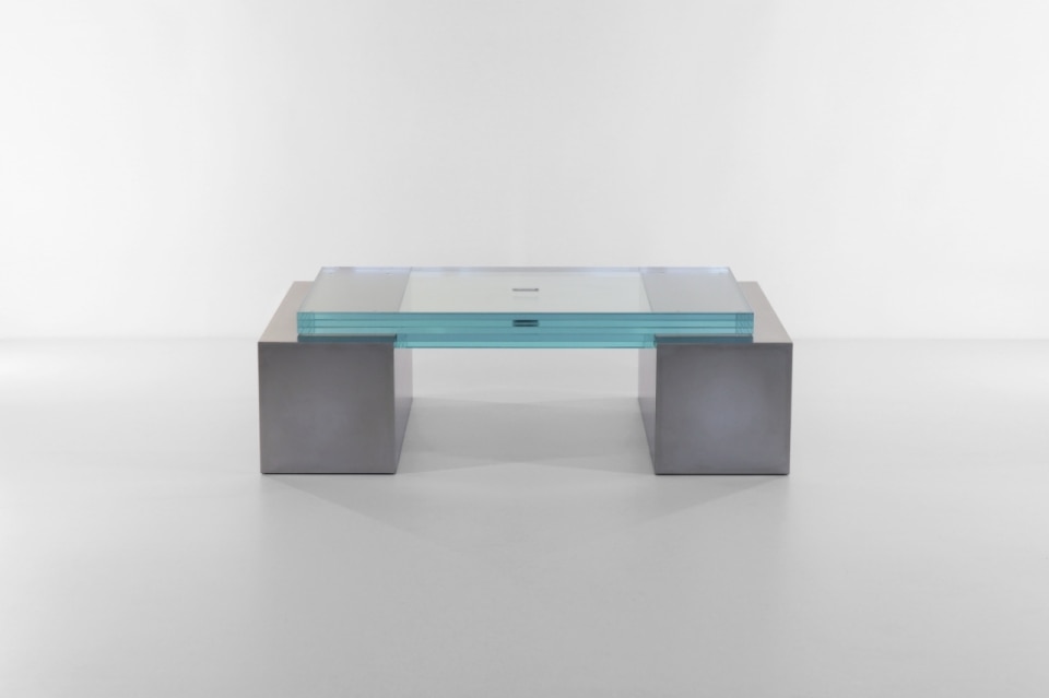 The coffee table is a one-of-a-kind piece made in 2023, and the thick sheet of glass that holds the sex tape is supported by two massive satin-finished steel legs. The work is part of the duo's production of "functional sculptures," placed somewhere between product design and art that investigates, through minimal structures that echo brutalism, natural and biological processes.