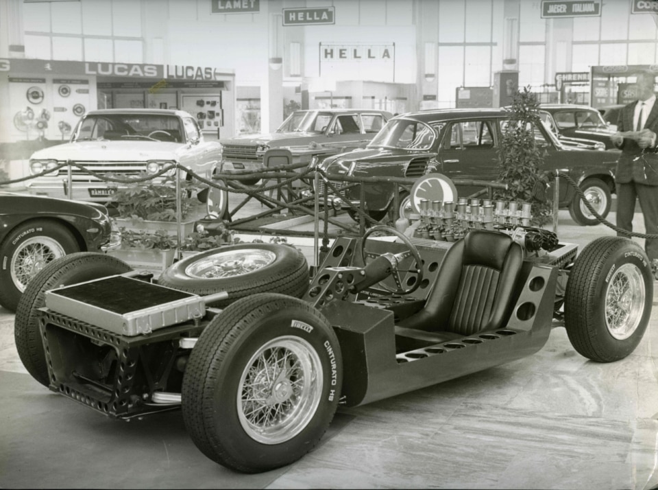 The front bonnet was long and sharply pointed. The headlights emerged beneath metal eyelids framed by the famous “eyelashes,” a graphic detail that made the car instantly recognizable. At the rear, the large engine cover—integrating fenders and luggage compartment—opened like a continuous shell, perforated by slats that were both technical function and aesthetic statement.