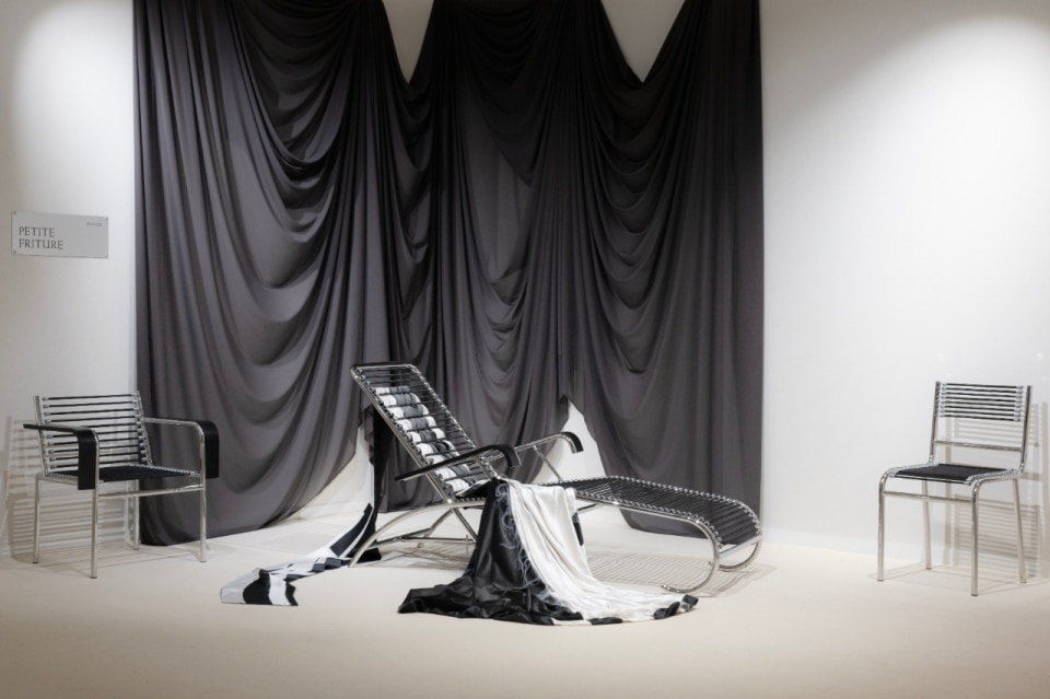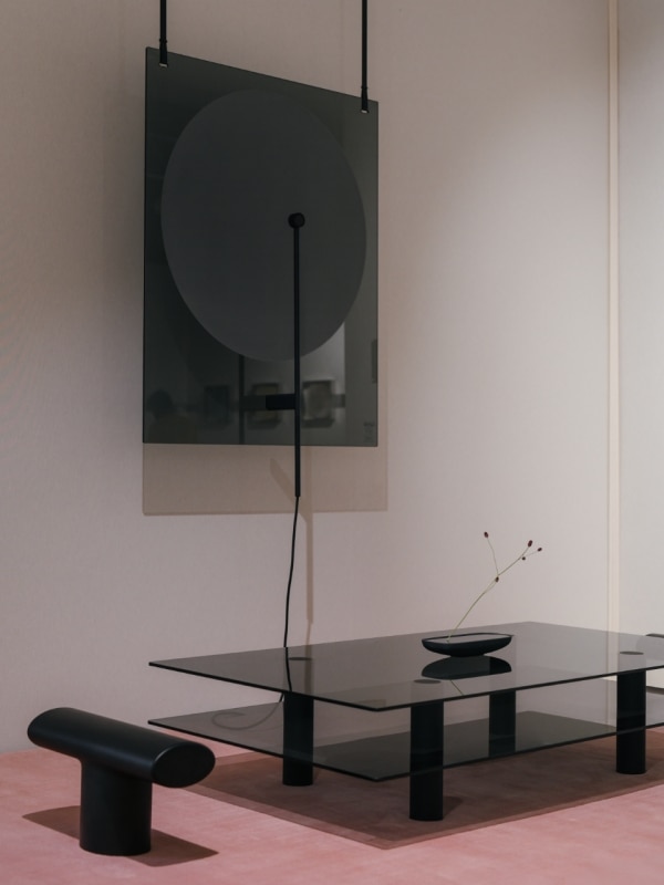 The living-room system, understood as an intimate and enveloping space defined by a seat, a lamp and a small table, is one of the configurations that most stimulate designers and is easy to identify among the stands. Within the heterogeneity of styles and formal proposals, the solution by Unknown, Untitled distances itself from the déco revivals and the preciousness-infused maximalism to bring us back toward a linear essentiality not far from Japanese aesthetics. Favoring black glass as its sole material of choice, the Paris-based studio creates a minimalist table defined by two parallel planes. Accompanying it are two meditation stools and an emblematic wall light source, a sort of black sun, also made of glass, that asserts itself as a mysterious and enigmatic presence.