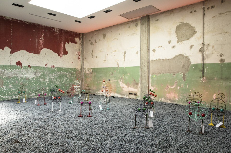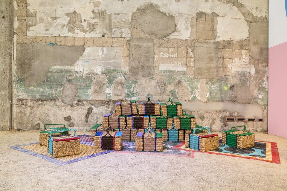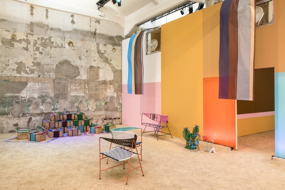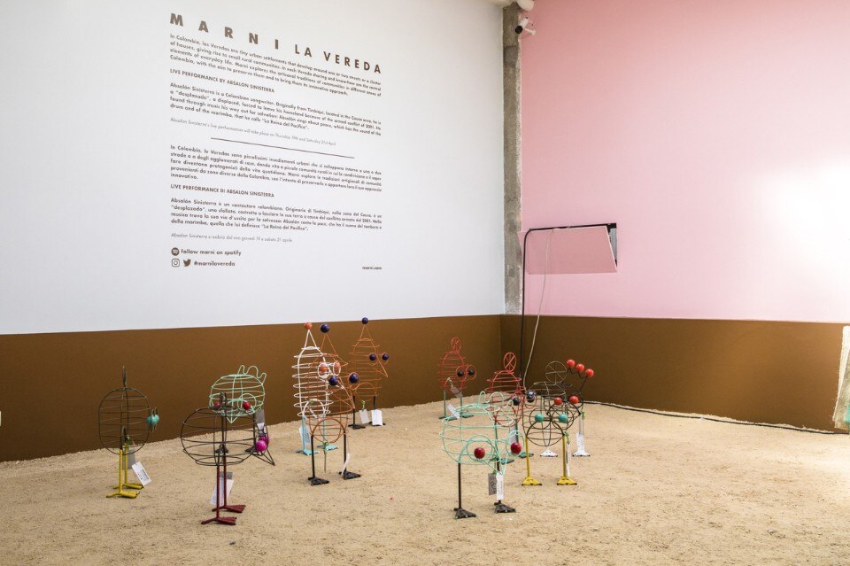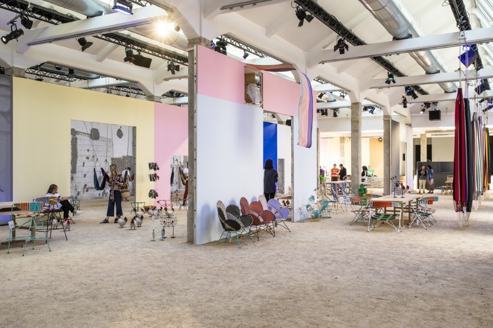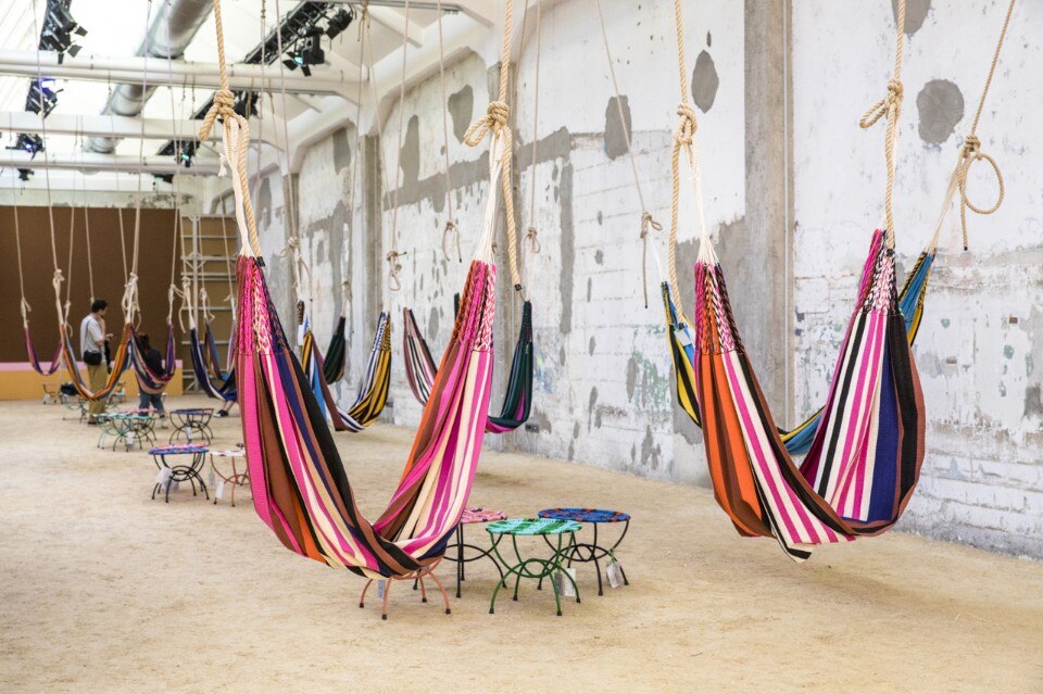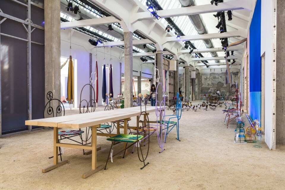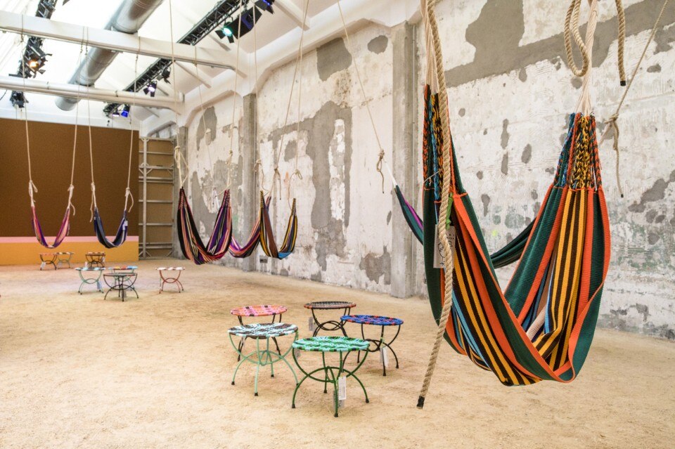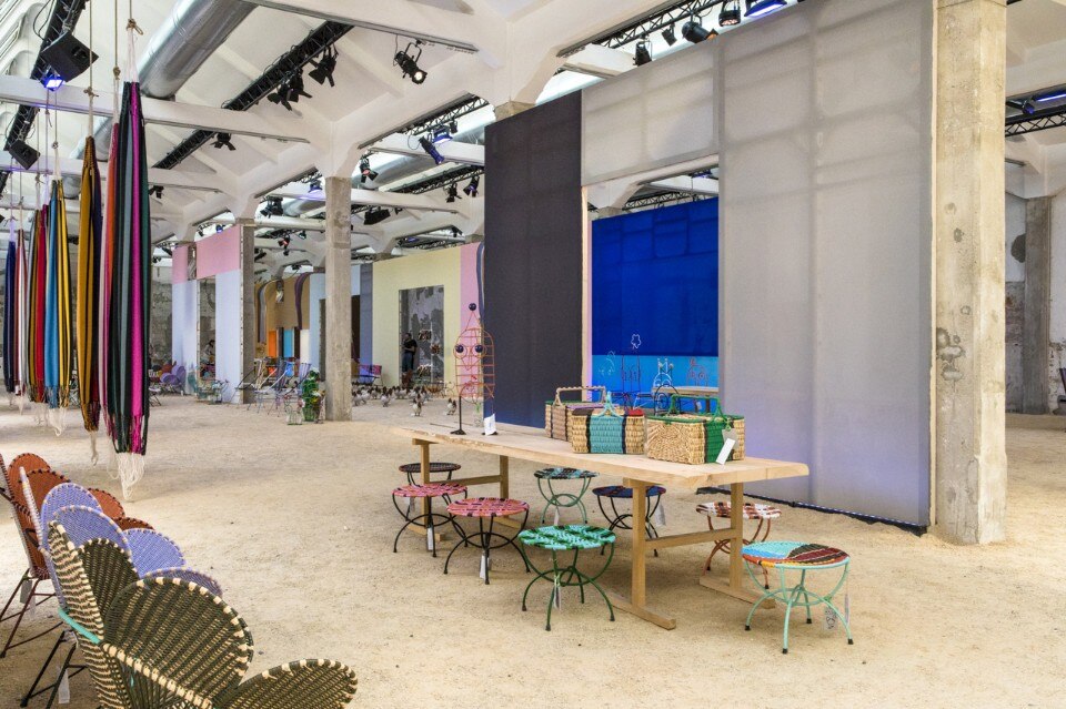 Instead, with Marni, we move on to cacti: once again, in all colours. In fact, the collection La Vereda, of a joyous Colombian inspiration, brought to the brand’s headquarters a motion-filled installation with maxi-swing, hammocks and joyful statuettes. Evoking Colombian veredas, micro urban settlements around few streets, the courtyard effect is immediate in this “market” where visitors can even purchase colourful bags (like the baskets made from weaving coloured plastic strands, according to the centuries-old tradition in the town of Ibagué where willow branches are crafted into objects). Plus, handmade 100% organic agave bags, light statues resembling cacti or papier-mâché and beaded chickens made by a community of women from Villanueva (one-off creations that take four days to make). And finally, the iconic Marni armchairs, with peacock wheel backrest.