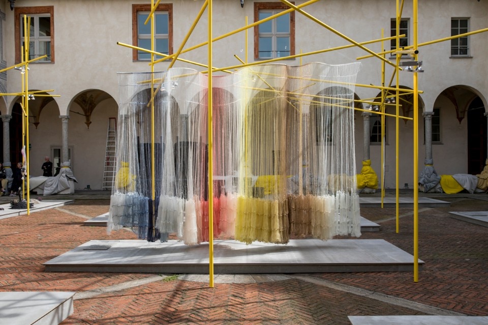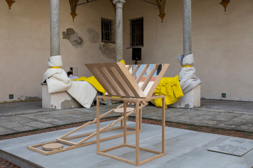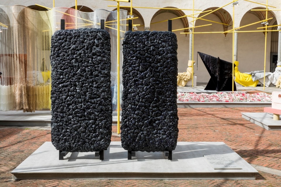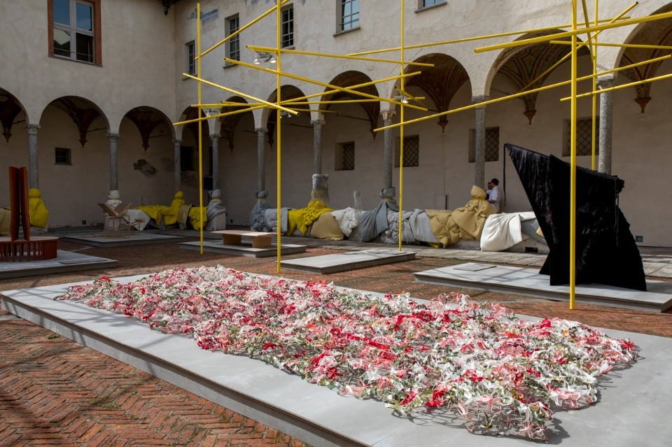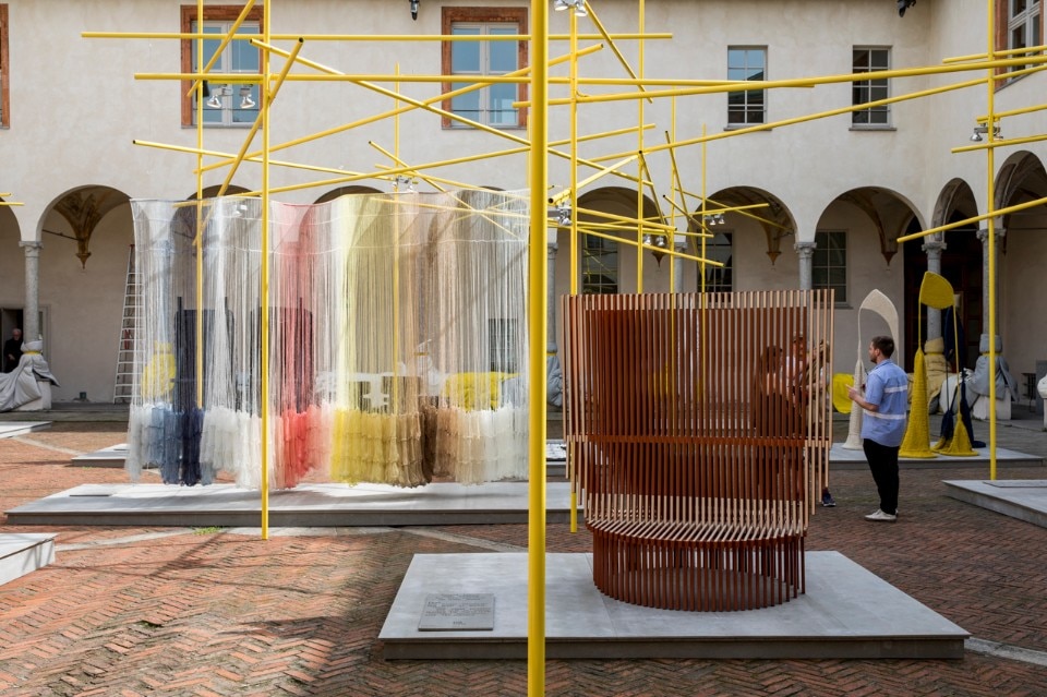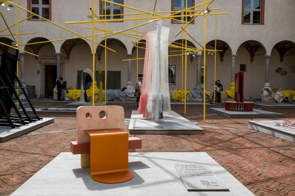 Padded textiles completely clad the low walls of the cloister to become comfortable seats. The 15 works chosen by Hammerstrøm share an experimentation with materials: from Aurora Borealis by Iben Høj, a textile sculpture with fibre filaments that are charged with sunlight and then light up at night, to the poetic A Family by Kasper Kjeldgaard, a structure composed of five round elements installed on equidistant pointy brass boards. Overall, the installation is homogenous with many courageous choices, but what’s missing is the amazement we became used to in past editions.