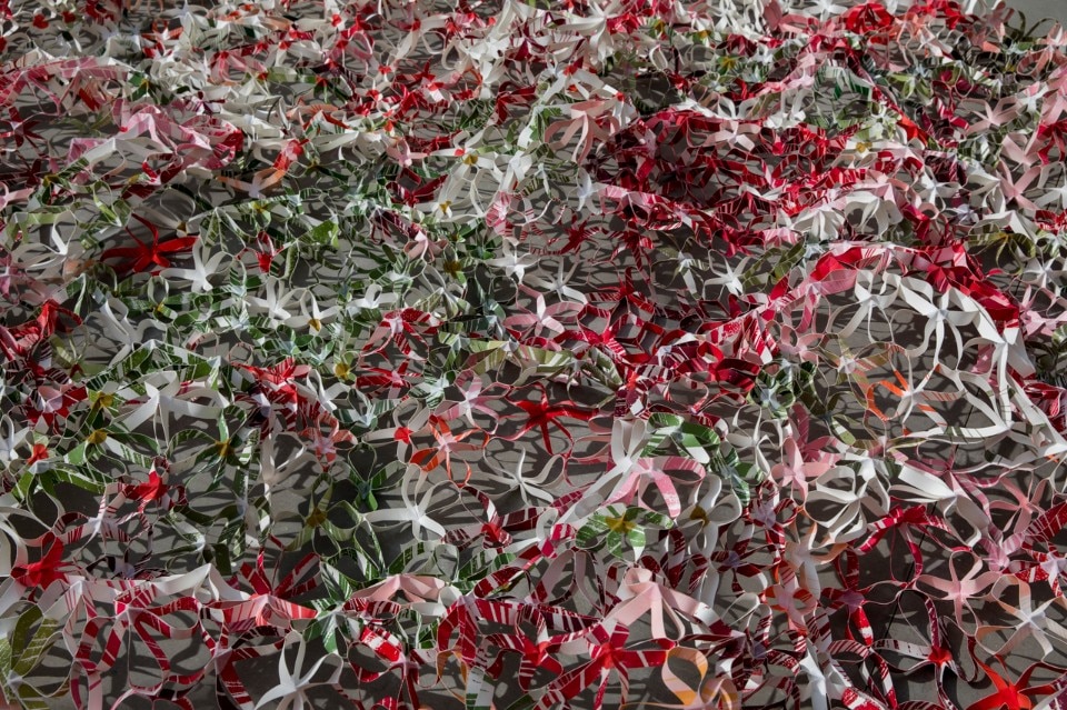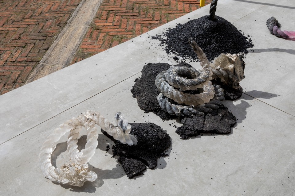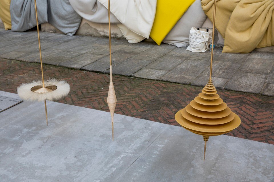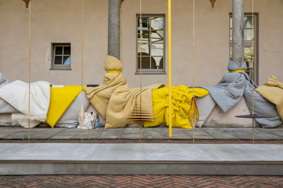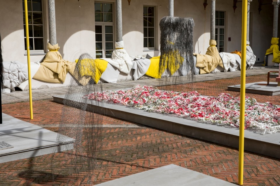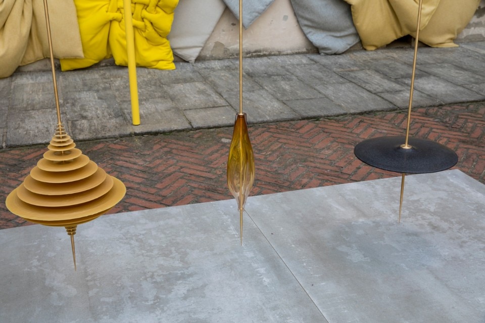 Padded textiles completely clad the low walls of the cloister to become comfortable seats. The 15 works chosen by Hammerstrøm share an experimentation with materials: from Aurora Borealis by Iben Høj, a textile sculpture with fibre filaments that are charged with sunlight and then light up at night, to the poetic A Family by Kasper Kjeldgaard, a structure composed of five round elements installed on equidistant pointy brass boards. Overall, the installation is homogenous with many courageous choices, but what’s missing is the amazement we became used to in past editions.