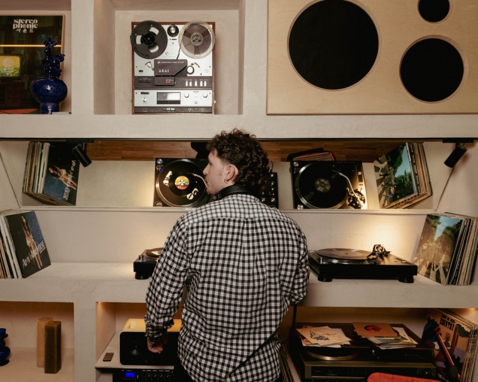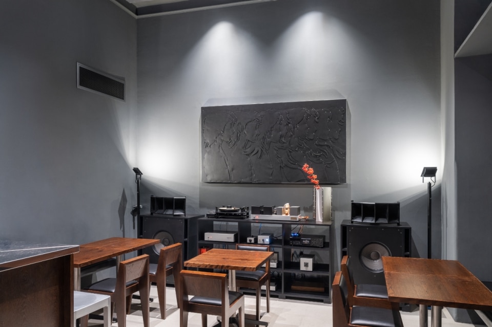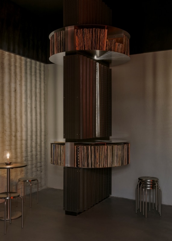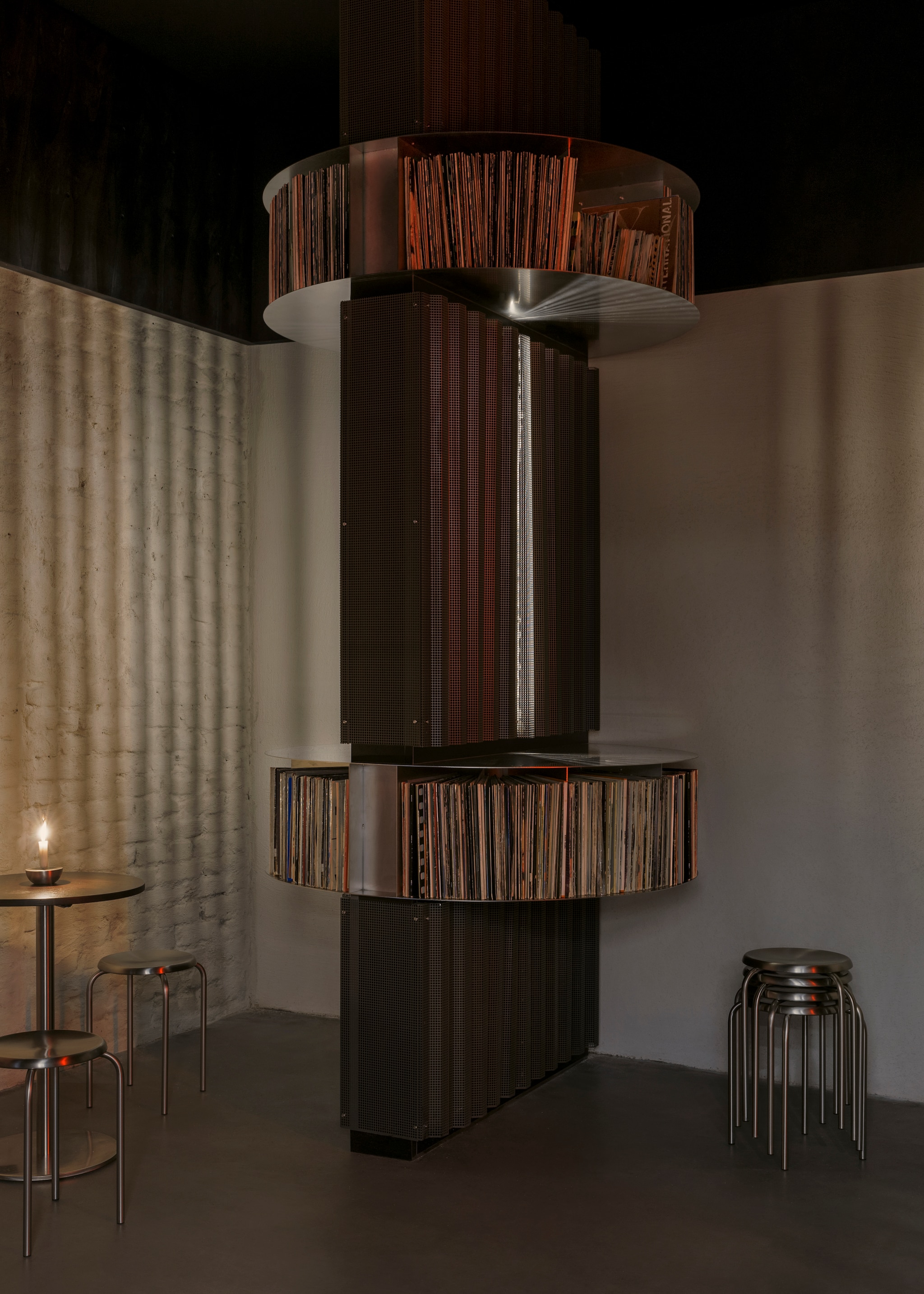 Onda, a cocktail bar in Città Studi designed by Solum, builds its space around a few sonic elements: a steel vinyl totem hooked onto existing pipes, a custom console, and vintage Altec speakers from the 1970s. Industrial lighting and stainless steel define the atmosphere more than anything else.