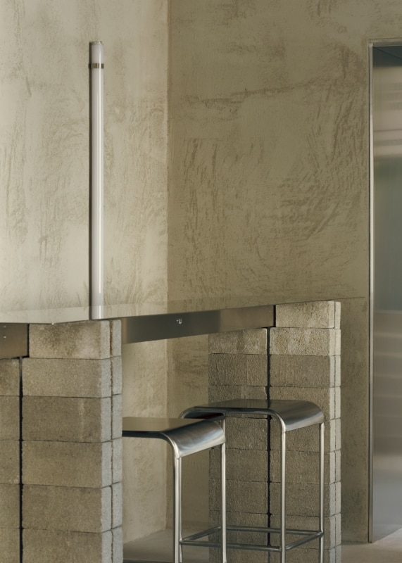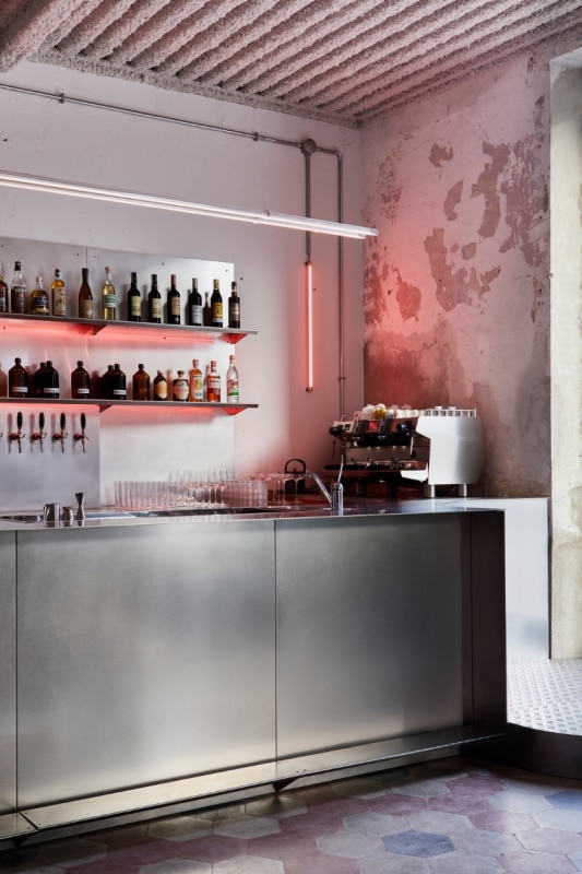 Bar Nico, in the Acquabella district—once a tire shop—designed by Sagoma Studio, revolves entirely around a single counter: a monolithic block of concrete and steel that resembles a surgical table.