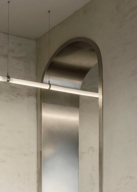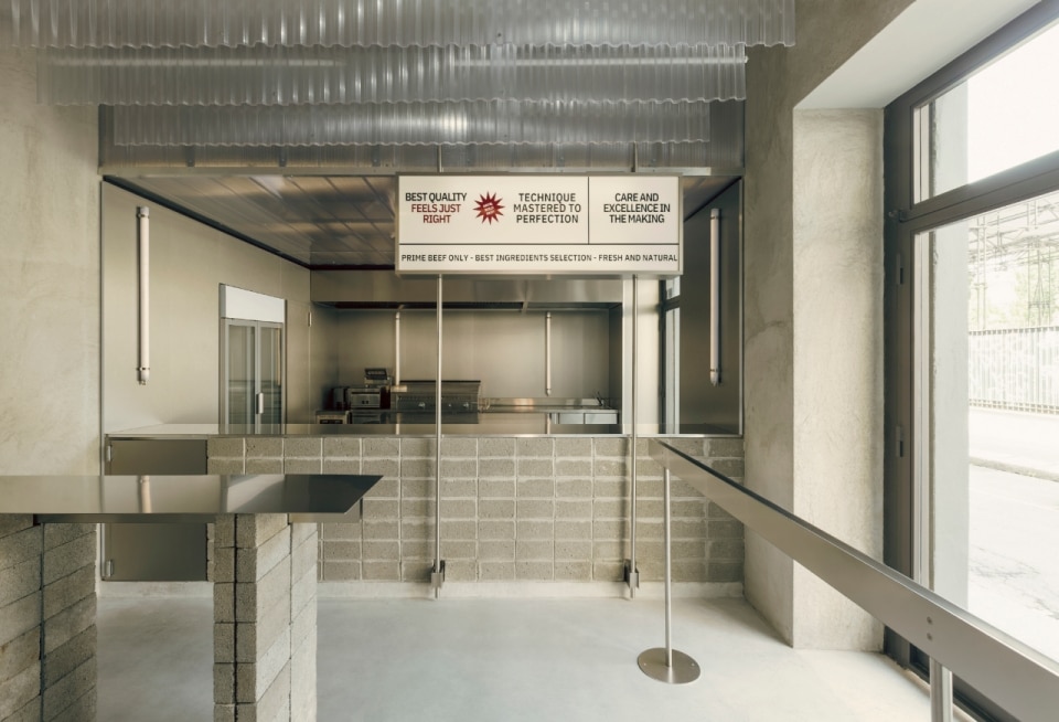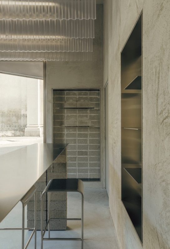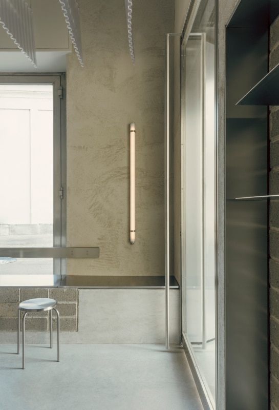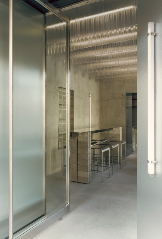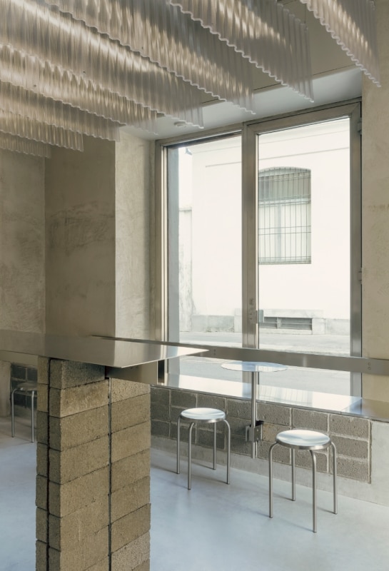 But metal is not confined to listening bars. On Via De Amicis, Street Smash Burgers—another Solum project—creates a seamless threshold between interior and exterior, with steel and technical surfaces shaping a compact, reflective environment. Balay, a Filipino restaurant on Via Maiocchi, works through insertions, retaining existing floors and walls while introducing metal and dark wood elements. And Sunnei’s flagship store, opened in 2025 in the Susa/Argonne area—only recently connected by metro—continues along Ufo’s line of urban regeneration, though as an anti–concept store defined by sterile white interiors and geometric metal furnishings.