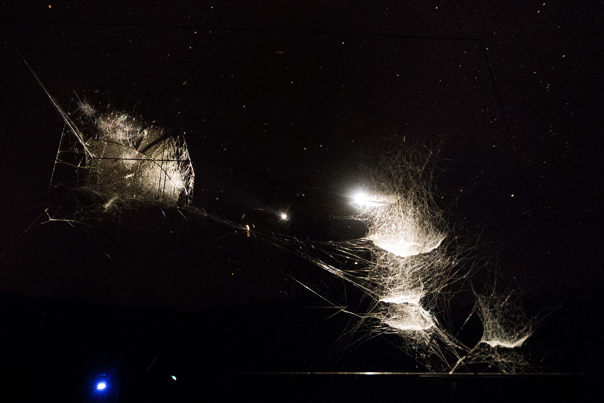 Metal structures that shelter enormous webs spun by spiders over the course of a month float suspended in the dark dome, lit by the dim light of the planetarium’s stars and intense beams of light.