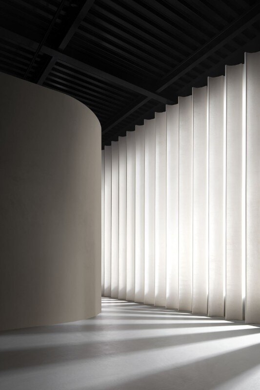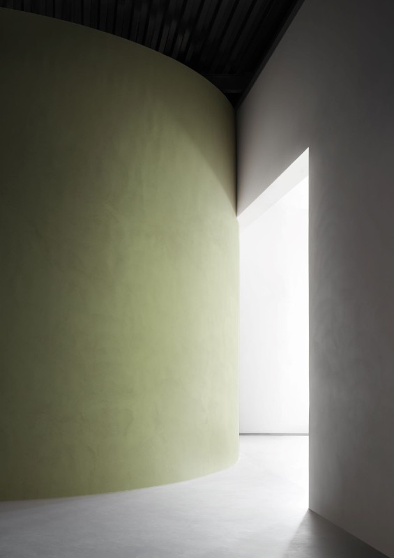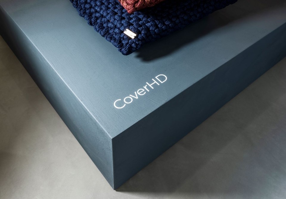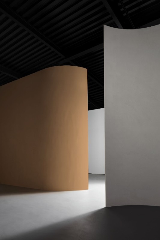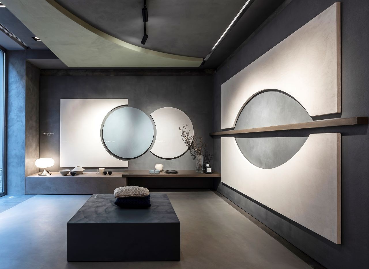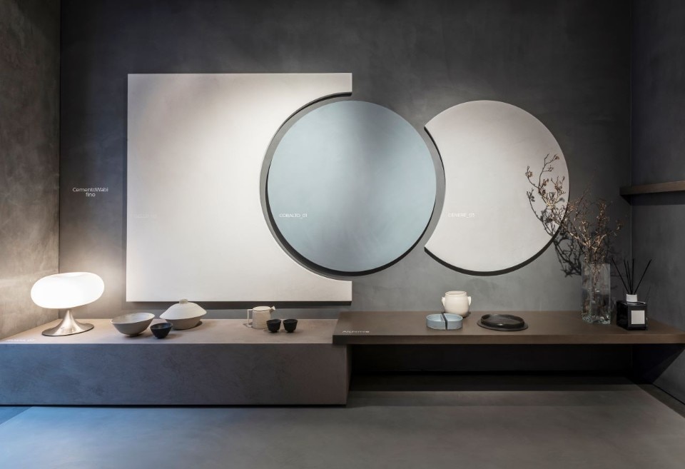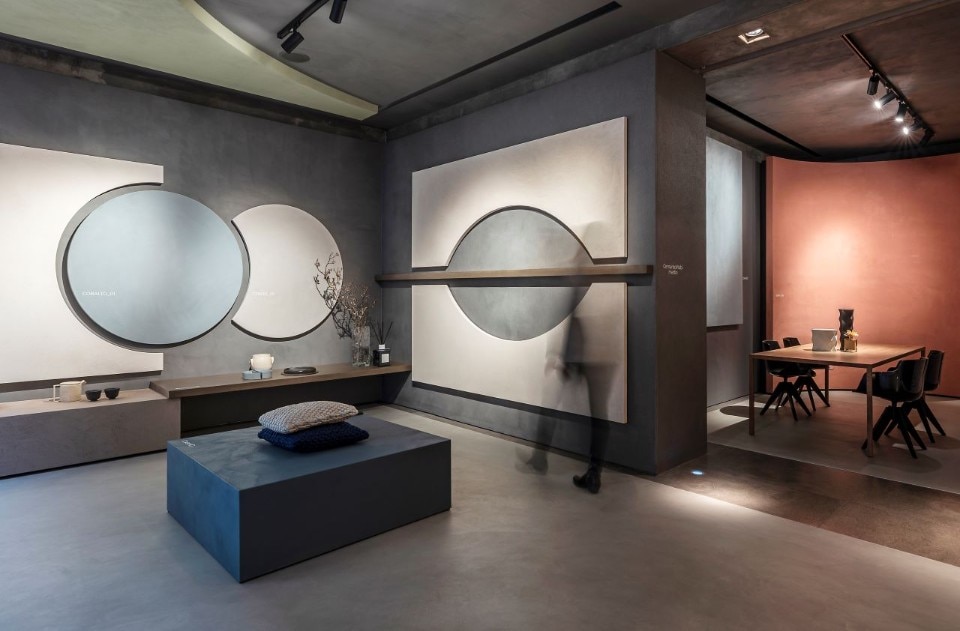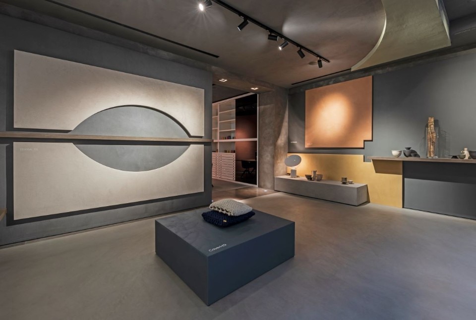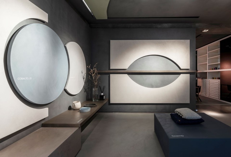 The granular composition makes the surfaces slightly rippled, available in 24 colour shades – from neutral to earthy tones, to blues and reds. The Milanese installation, designed by the company’s art director Marco Carini, features regular, sinuous shapes inspired by Carlo Scarpa.