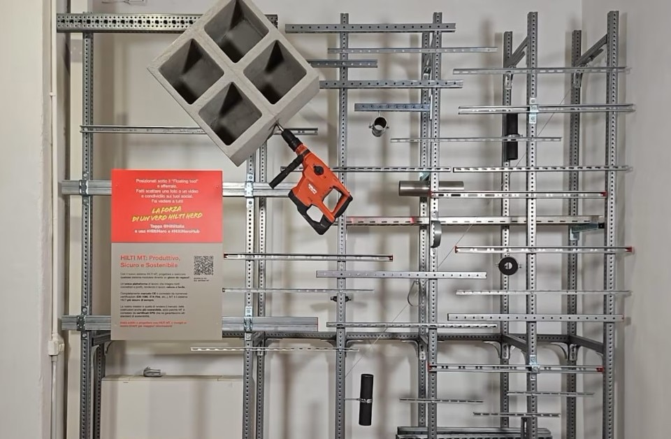 Two key installations define this space. “Emozioni verticali” (Vertical Emotions) celebrates the wall in its raw, essential honesty – as a fundamental element of construction and a setting for labor. It also honors Hilti’s tools as true design objects, uniting workers and visitors in the shared experience of being Hilti Heroes. “Floating Tool” invites visitors to lift a metaphorical concrete block using a Hilti tool, offering what the company calls a “poetic” vision of the central role of people in construction.
