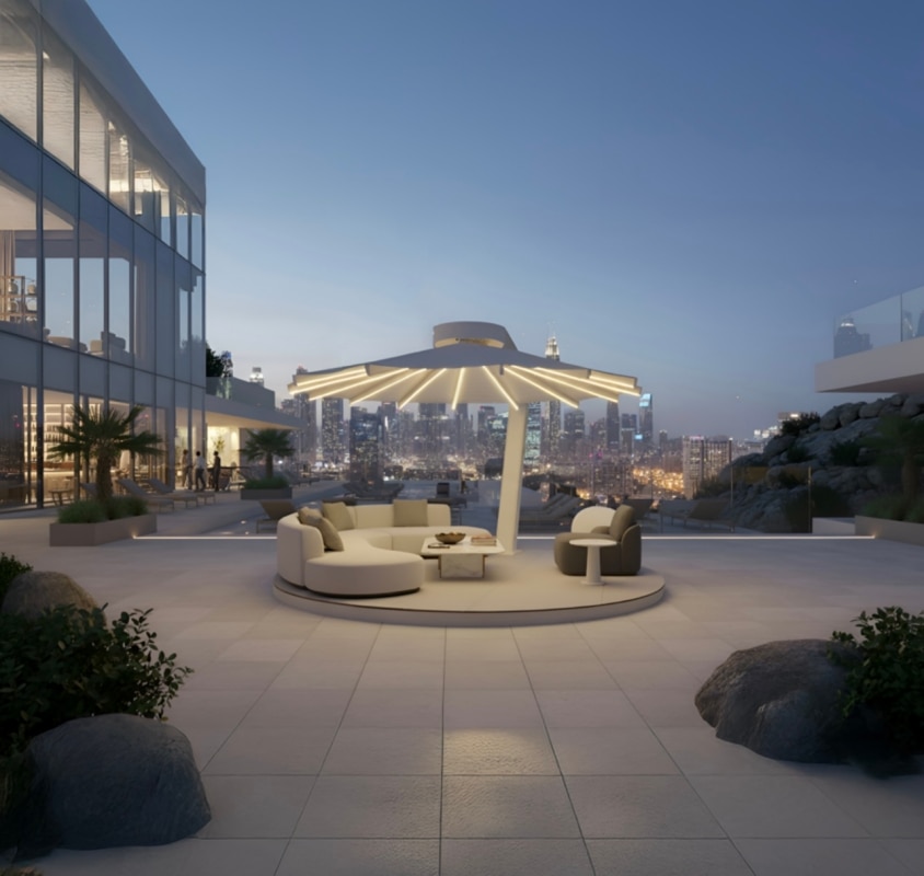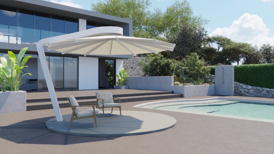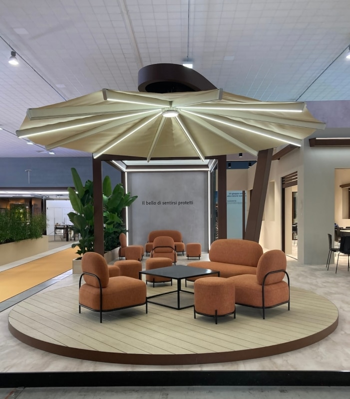 Completing the narrative is Papillon, the shading system designed by Giulio Iacchetti and first presented during Milan Design Week 2025. Inspired by the light movement of butterfly wings, the project – also recognised with international design awards – redefines the concept of shade through a single, decisive gesture: the elimination of the central pole. This approach is complemented by smart features including automatic closing, wind detection, and integrated dual LED lighting, extending usability into the evening hours.