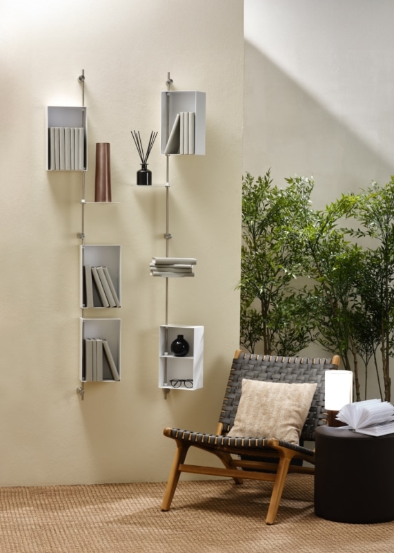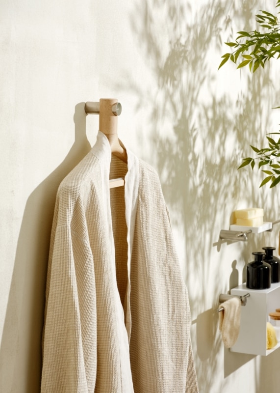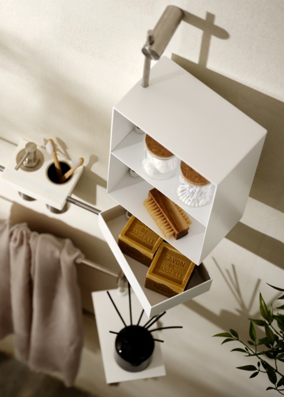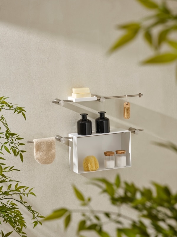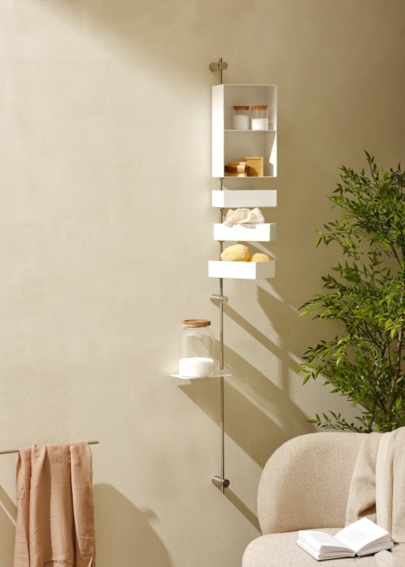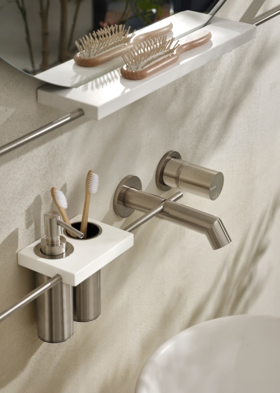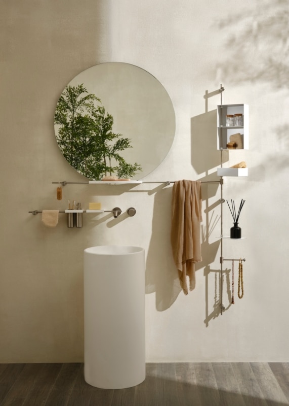 The system’s strength lies in its exceptional combinability. Shelves, soap holders, bars, and supports for towels and bathrobes integrate with new components in dynamic, open-ended configurations that can evolve over time. Each composition establishes a precise visual rhythm, where the flow of water connects elements and generates a coherent micro-architecture with a clear, recognizable identity.
