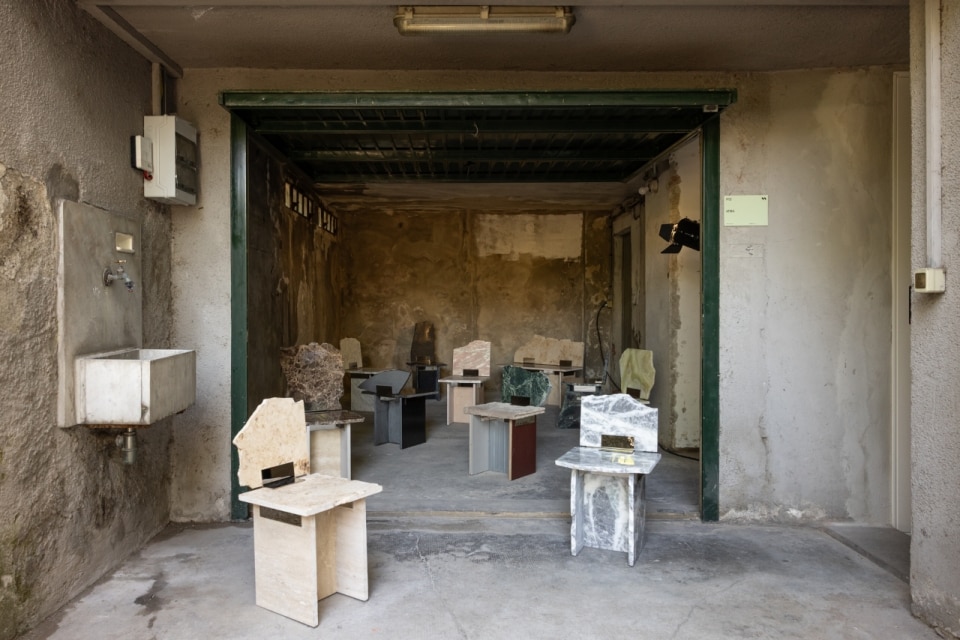 Other projects also animate the space, including that of the Paris-based maison Issé, which debuts its first collaboration with architect and designer Sophie Dries. One of the first-floor rooms is transformed by a large ceiling-mounted textile installation, exploring the expressive and spatial potential of raw plant fiber. Even the garage becomes part of the exhibition, with an installation by AtMa investigating the reuse of surplus materials in production systems, featuring seemingly rough seating elements that deliberately expose their joints.