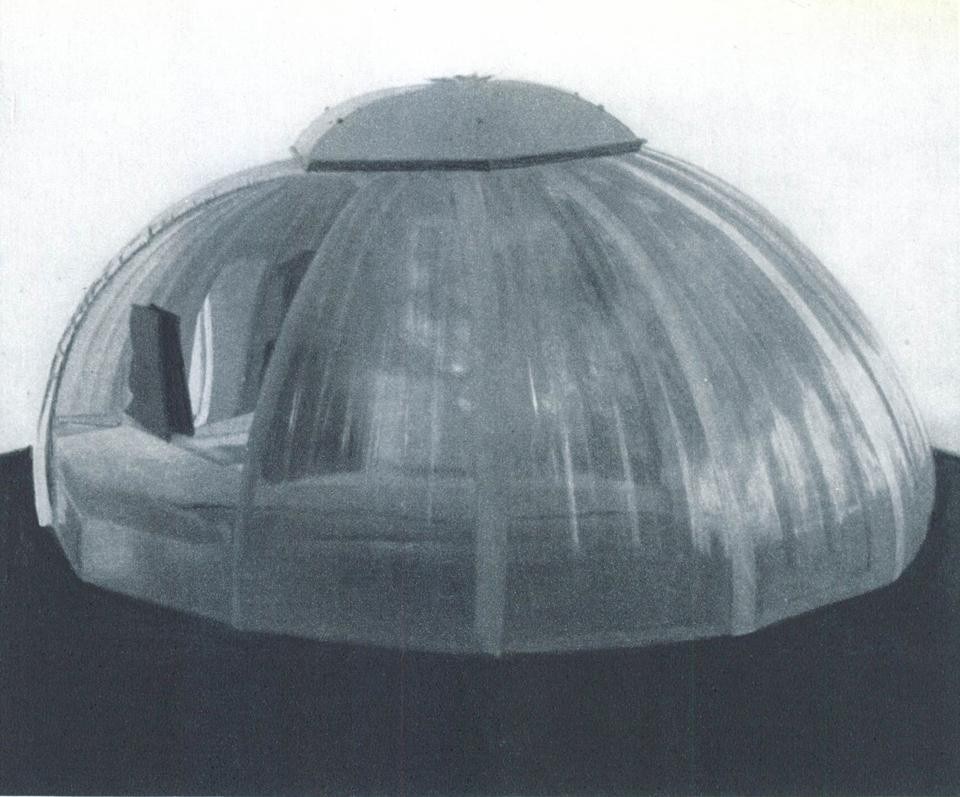 When travelling, the house is reduced to the mere volume of the facilities cell (kitchen and bath), mounted on a wheeled trailer, a volume of 5,98 cu. metres. On reaching the site chosen for the stop-over, the house "develops" in less than half an hour into a dome covering an area of 24,80 square metres. The side walls of the facilities cell are lowered horizontally becoming a hexagonal floor, and the translucid lid of the cell rises (by means of a pneumatic winch) releasing the tent which is blown up to form the dome (a compressor connected to the car engine is used). The dome contains six pneumatic beds and six revolving clothes supports.