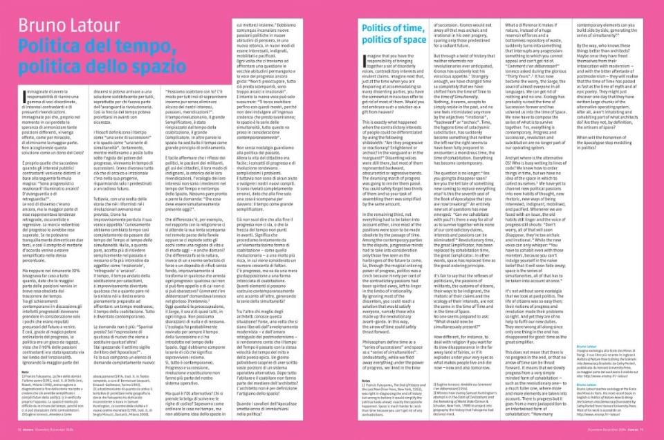 No one seems prepared to ask: “What should now be simultaneously present?” How different, for instance, to deal with religion if you wait for its slow disappearance in the far away land of fairies, or if it explodes under your very eyes as what makes people live and die now — now and also tomorrow. What a difference it makes if nature, instead of a huge reservoir of forces and a bottomless repository of waste, suddenly turns into something that interrupts any progression: something to which you cannot appeal and can’t get rid of.
