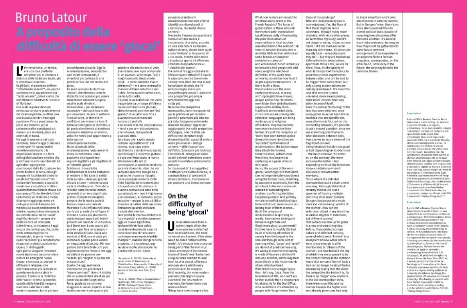 Hence the success of the word glocal, which signifies that labels can no longer be safely positioned along the former scale, stretching, by successive extensions, from the most local to the most universal. Instead of subtracting one another, conflicting identities keep being added. And yet they remain in conflict and thus have to be sorted out, since no one can belong to all of them at once… But if the compass of modernization is spinning so madly, how can we distinguish between legitimate and illegitimate glocal attachments?