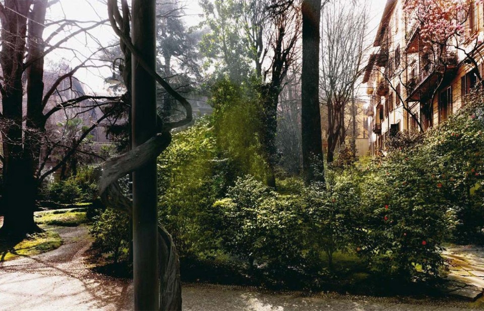 Very secluded, very secret. Impenetrable. I imagine this to be a leftover park behind the series of buildings neatly aligned along Piazzale Baracca, which was dominated by the Porta Vercellina del Canonica in times gone by. The park even includes the villa that was built to preside over the garden. It is an unexpected experience to cross the threshold of the main door of a residential building that is like so many others in this neighbourhood and find yourself in front of an aristocratic gate that gives access to a hillock park watched over by a mansion with noble features. The unusual scenery can be observed from the corner of your eye, or with eyes half closed to sharpen your sight, or in some other invented way in order to explore this rare case of a garden knoll-with-villa imprisoned in the vaster urban plan.