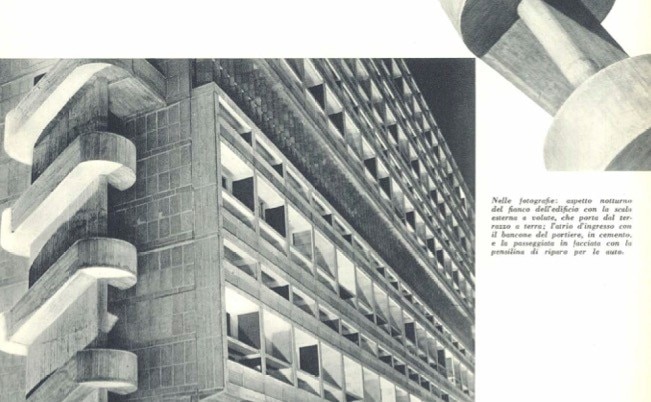 Concrete is the substance of this architecture, as stone was for the pyramids, and here it becomes a monumental material, equalling the size of the building.This architecture is a concrete sculpture: it is correctly left bare, like bronze, marble, stone. Naked not only in the outer surfaces, but also in the inner surfaces of entryways, corridors, etc., this being not an architecture-involucre, an outer shell to an inner organism, but a unique block carved and sculpted out of a unique material, in the shapes required to be inhabited at the inside.