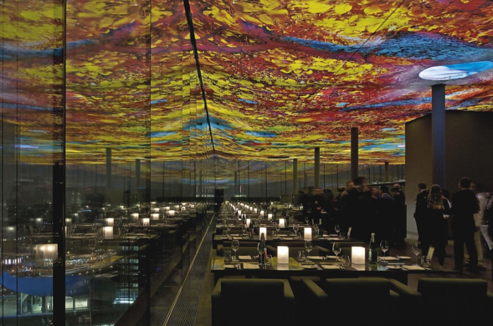 But the importance of the ceilings by Rist, who was called upon to contradict on a horizontal plane all that goes on on the vertical (but not completely) plane, is something more. Not only is her role a classic no different from Georg Kolbe’s bronze Alba statue in the Barcelona Pavilion, to name a quintessential example of the Modern Movement. It is a phantasmagorical, fluid, nocturnal gift to the city. And Nouvel, who is the greatest surviving exponent of modernity, having breathed in its last vapours (according to Casciani’s Pritzker essay describing him in 2008) accompanies its transition by sublimating it, not without angst, in contemporary liquidity.