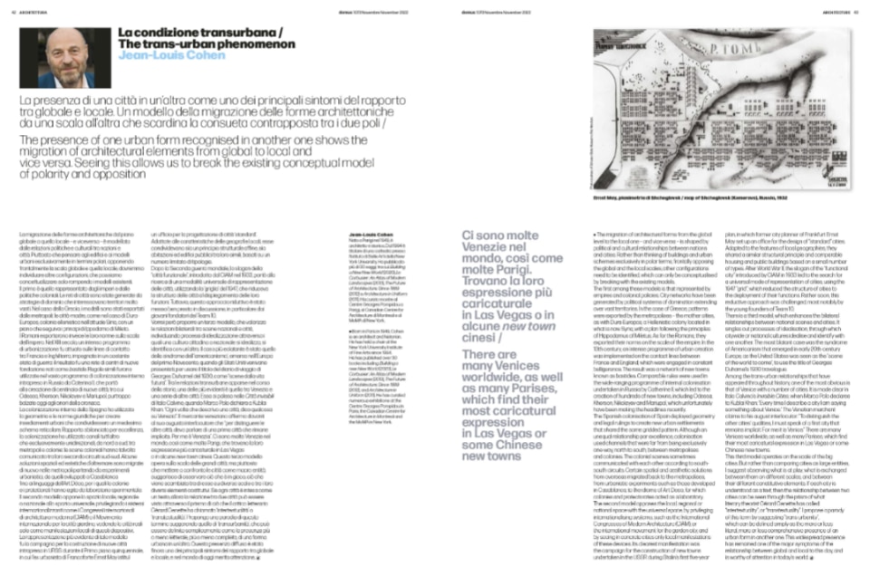 Through his life as a historian, critic, curator, and researcher Jean-Louis Cohen leaves the legacy of a cross-perspective view of history, able to read in architecture the sign of global and local politics, shedding light on the intimate interconnection, on the “interferences”, as one of his exhibitions was titled, of different trajectories and events impossible to consider as separate.