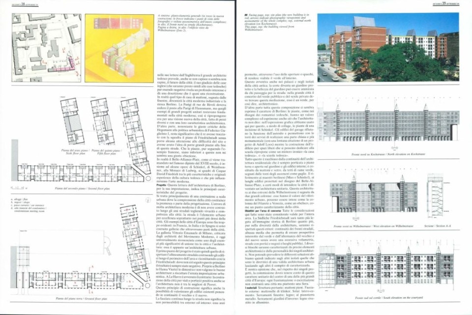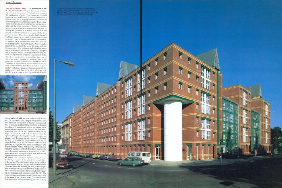 “The problem of building in Berlin and of building a block in the centre of Friedrichstadt concerns the architecture of a city”. In the context of IBA 1987 – Internationale Bauausstellung, the urban-scale building exhibition creating new residential buildings and open spaces intended to redefine new centralities and forms mainly in the historic fabric of West Berlin – Aldo Rossi with Gianni Braghieri had won the competition for a block back in 1981, and then focused on the development of lot 10, in the southern quadrant of Friedrichsstadt. The project became one of those operative expressions of the theoretical, urban and typological reflections that had placed Rossi in a distinct position in the Italian and international architectural debate, soon an icon of the translation into built form of his designs, destined to be received as a style. Domus published its images and report in September 1988, issue 697, with a clear investigative purpose: “All the themes on the form of the city that have characterized the work of Aldo Rossi are distinctly clarified here in Berlin. Translated into concrete form are the limit and the interest of his architecture”.