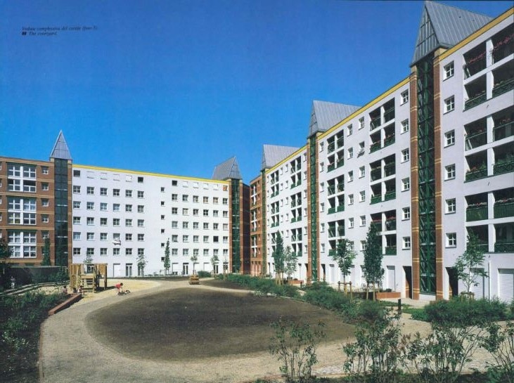 This principle of planning also means the possibility of enhancing existing buildings by continuing the old with the new. The continuous facade along the street does not entail an impermeability between exterior and interior: on the contrary it makes it possible, through the use of apertures or gaps, to make gardens and greenery visible from inside. This also happened in the buildings and blocks of the old city. The courtyard becomes a protected garden and the garden’s beauty can be admired by people walking along the street. In the big city the concept of public and of private gardens has to be mediated in this way, becoming, so to speak, an architectural garden.