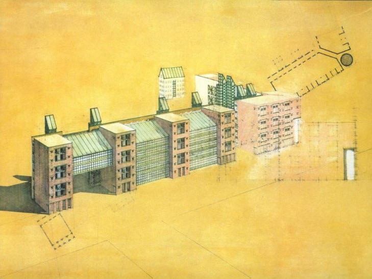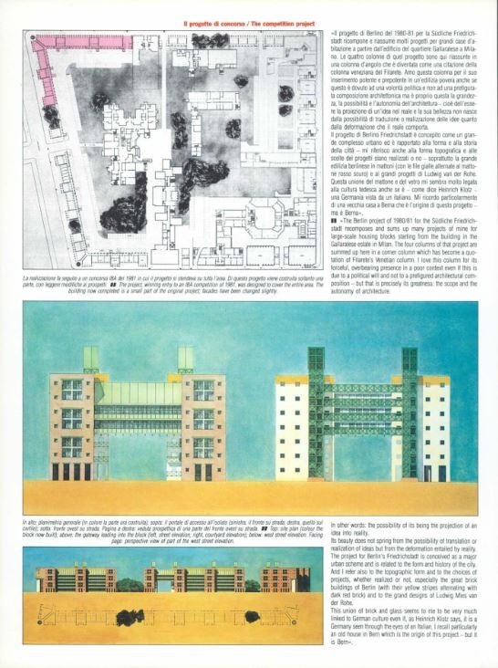 “The Berlin project of 1980/81 for the Südliche Friedrichstadt recomposes and sums up many projects of mine for large-scale housing blocks starting from the building in the Gallaratese estate in Milan. The four columns of that project are summed up here in a corner column which has become a quotation of Filarete’s Venetian column. I love this column for its forceful, overbearing presence in a poor context even if this is due to a political will and not to a prefigured architectural composition - but that is precisely its greatness: the scope and the autonomy of architecture. In other words: the possibility of its being the projection of an idea into reality. Its beauty does not spring from the possibility of translation or realization of ideas but from the deformation entailed by reality. The project for Berlin’s Friedrichstadt is conceived as a major urban scheme and is related to the form and history of the city. And I refer also to the topographic form and to the choices of projects, whether realized or not, especially the great brick buildings of Berlin (with their yellow stripes alternating with dark red brick) and to the grand designs of Ludwig Mies van der Rohe.