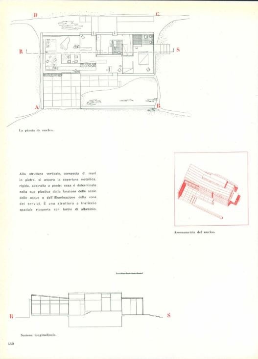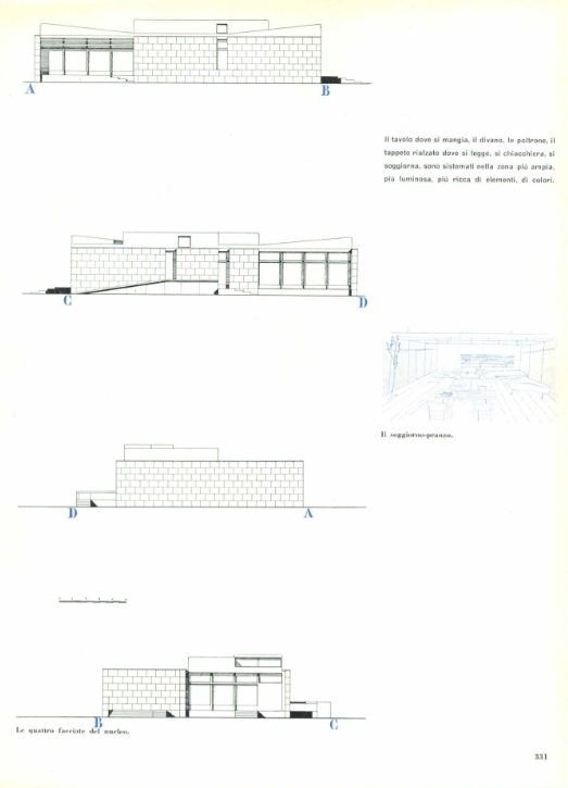 The chair for work, the table for work, the accommodations for wardrobe work, are in a smaller, more protected, less bright area. This way, the spaces are even more limited in the dressing room where my bed is located, to get bigger around the big bed. Behind this, less open, is the place where the infant sleeps. The terraces, arranged along the western and southern side of the house (the latter screened by a masonry wall) extend the life of the interior out into the lawn.