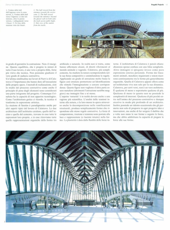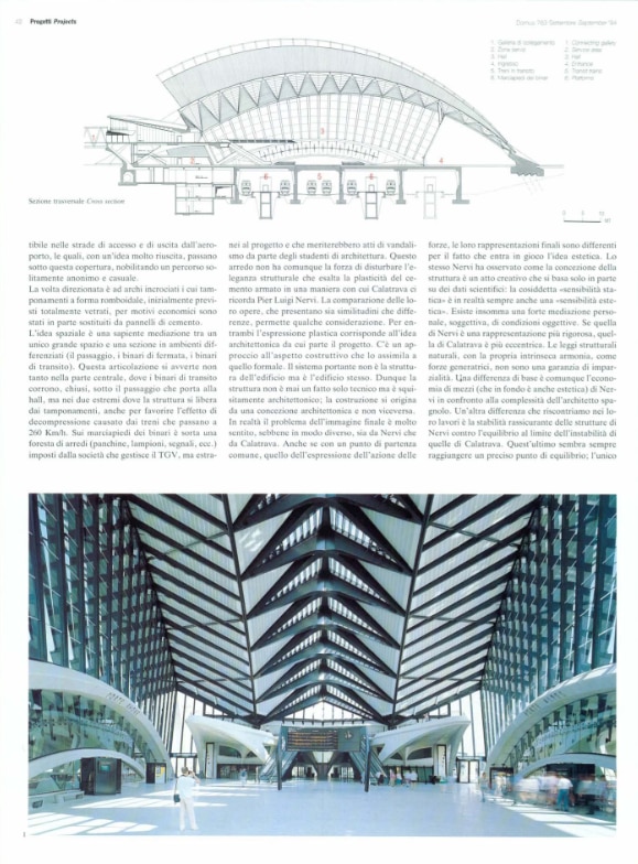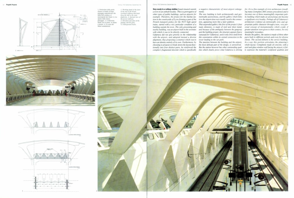 The train and airplane station that one of the most innovative voices of futurism, Antonio Sant'Elia, envisioned in 1914. This was the image that, in 1994, came with some ease to be associated with the project with which Santiago Calatrava opened a relevant season in the conception of public infrastructure, and also in his career. The Lyon-Satolas station, now called Saint-Exupery, connecting two frontiers of innovation in transportation, that is, an airport and the high-speed train line, would be followed by many projects of large structures for the community with organic-inspired forms, for culture such as the City of Arts and Science in Valencia, and again for transportation, such as the Mediopadana station in Reggio Emilia and The Oculus at the World Trade Center in New York. The beginning of this story, of a first built formulation of this kind of structure, after projects of varying evocative scale, including a cabaret, was published on Domus in September 1994, issue 794.