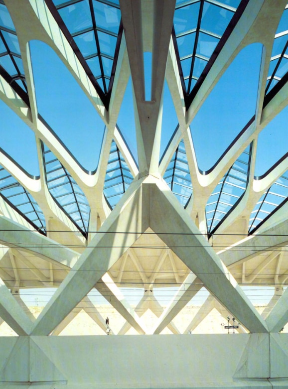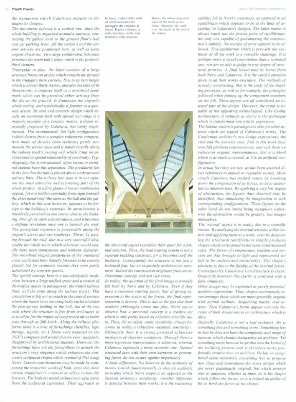 The Satolas station is paradigmatic also for other aspects which are typical of Calatrava’s works. The Catalonian architect’s two design expressions, the steel and the concrete ones, find in this work their own full pertinent expressiveness, and with them we rediscover organic representations, that is a blend which is as much a natural, as it is an artificial configuration. In actual fact they are not, as has been asserted direct references to animal or vegetable worlds. More simply Calatrava has studied nature by breaking down the composition of its forces, so as to assimilate its inherent laws. By applying a very low degree of abstraction, the figures thus obtained may be identified, thus stimulating the imagination to seek corresponding configurations. These figures on the other hand do not intend being metaphors (otherwise the abstraction would be greater), but images themselves.