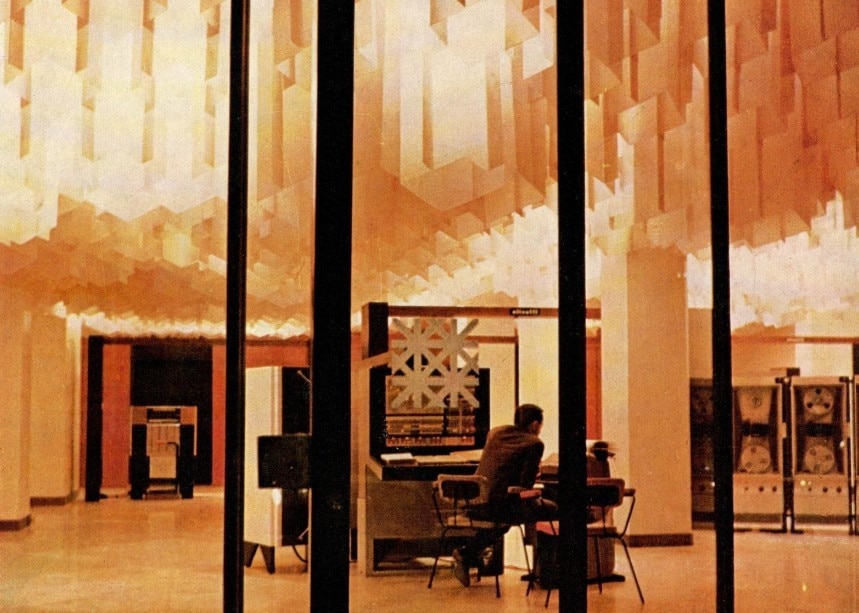 An electronic machines showroom for Olivetti-Elea. A space that attracts attention from the outside, like a sign, without requiring the public to enter (and they do not enter: the machines are in operation).
