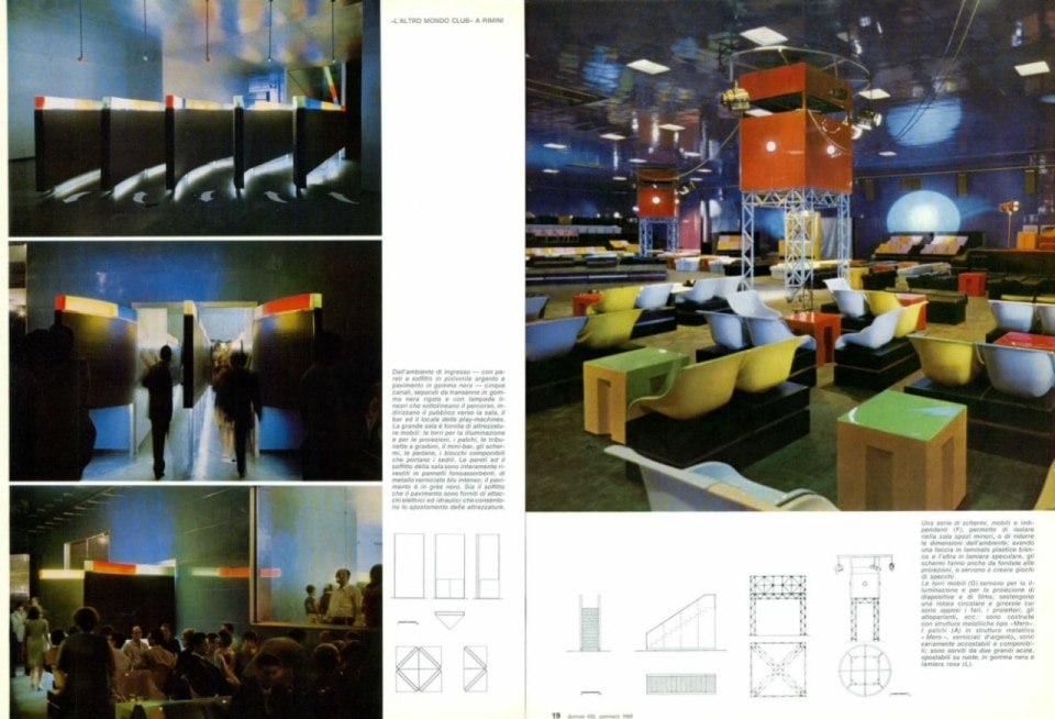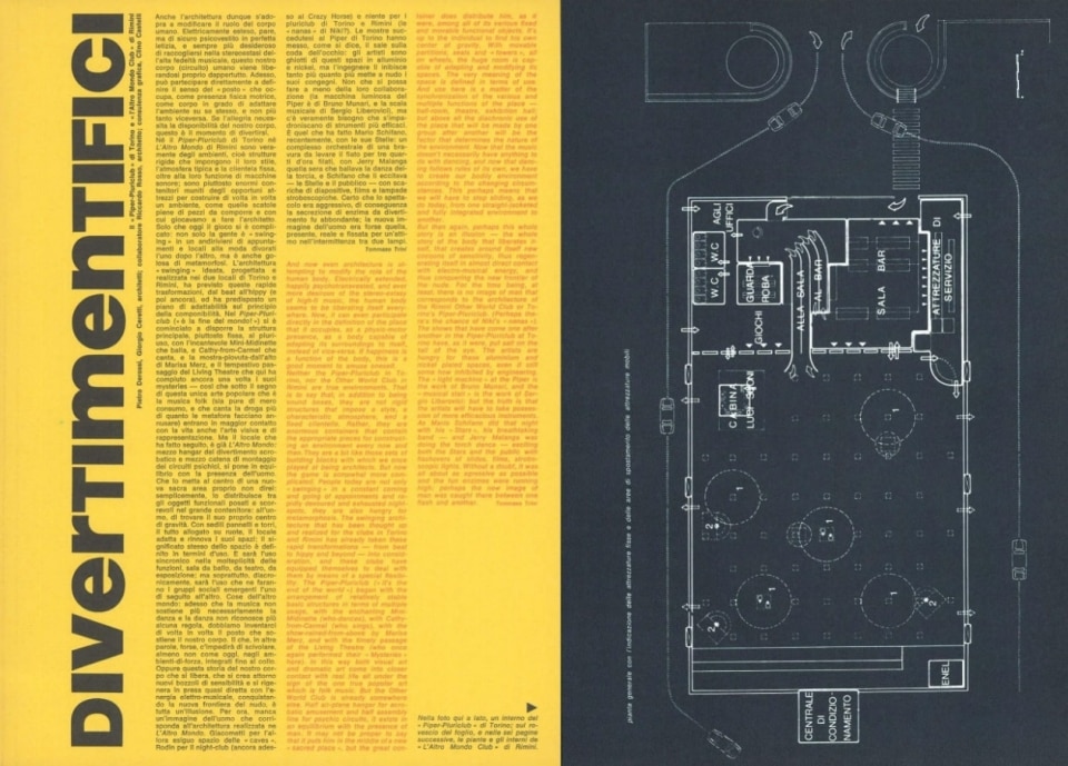 Neither the Piper-Pluriclub in Torino, nor the Other World Club in Rimini are true environments. That is to say that, in addition to being sound boxes, they are not rigid structures that impose a style, a characteristic atmosphere, and a fixed clientelle. Bather, they are enormous containers that contain the appropriate pieces for constructing an environment every now and then. They are a bit like those sets of building blocks with which we once played at being architects. But now the game is somewhat more complicated. People today are not only « swinging » in a constant coming and going of appointments and rapidly devoured and exhausted nightspots, they are also hungry tor metamorphosis. The swinging architecture that has been thought up and realized for the clubs in Torino and Rimini has already taken these rapid transformations — from beat to hippy and beyond — Into consideration, and these clubs have equipped themselves to deal with them by means of a special flexibility.