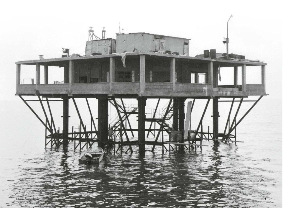 “Should our ocean liner have found itself in the northern Adriatic in early 1968, approximately six nautical miles off Rimini, its passengers would have spotted a very singular work of architecture: a small platform, square in plan, immobile in the middle of the sea. They would have noted how it is almost identical in size to the Villa Savoye, and might have observed how the deck was suspended above the Mediterranean by slender pilotis, between which boats could dock and unload passengers in much the same way in which automobiles offloaded their passengers directly into Le Corbusier’s iconic house via its underbelly.”