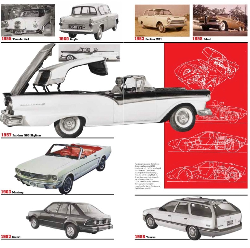 On the whole, in a see-sawing of often original stylistic rediscoveries. anonymous sedans such as those of the Fordor generation, were superimposed on sophisticated niche products, such us the evergreen Thunderbird; and big sales hits, like the mythic Mustang, helped to blot out the memory of sensational flops like that of the Edsel; while utility cars such as the Escort went hand in hand with super-sports models like the GT40.