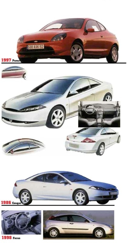 The calculated balancing of features ought to allow a continuous updating of cars by fully exploiting the matching of different types, markets and tendencies. The prevalent component, the graphic one, lends itself to any number of modulated signs, now light — where more decency is required — now charged — where public niche allows for greater vulgarity. Examination of the four cars presented to date already permits some comparisons. The earnest anti-automobile playfulness of Ka attracts a public with easy and immediate tastes; the sporting ambitions of the Puma are reflected in the greater fluidity of more stylized lines, and the reference to the real GTs is fundamental in boosting the image of the small sports car. The well-outlined solidity of the Focus, which in the sedan and SW versions tends almost to normality, is suited to a wide public interested in a medium car for medium people. The deliberately top-heavy originality of the Cougar is undoubtedly related to the desire for distinction felt by a public at once more mature and more exhibitionist.