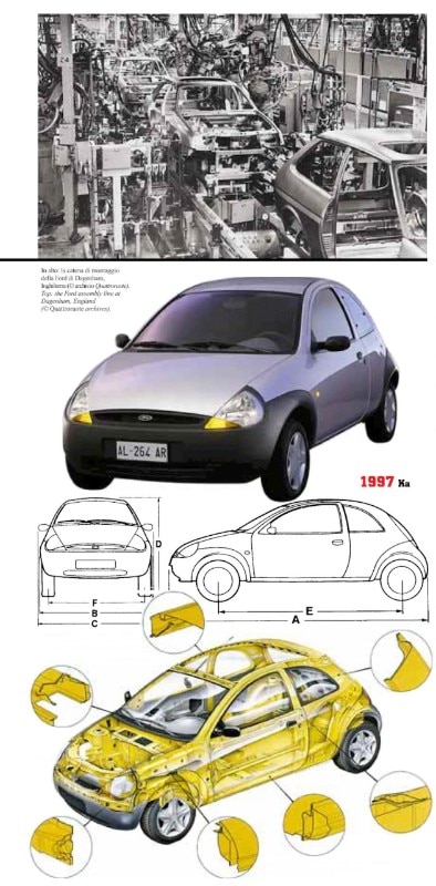 Read in these terms the purpose of New Edge is plainly to create distinction, dynamic force and innovative elegance: a question of style, then? To quote Claude Lobo, former manager of the Ford Small and Medium Vehicle Center, “it is not a matter of style or surface treatment: the New Edge is a way of working. It is true that the clean sharp intersections are created to heighten the character of the car, but they also stem from the desire to improve and facilitate the production process and to give better quality”. Thanks to New Edge, the plate can be stabilized during moulding, reducing rejects in body production time which, in the ease of Ka, comes to 30%. In addition to that, aerodynamic, functional and ergonomic engineering has revised design criteria for the whole package to improve its overall efficiency. Thus in the case of the Ka, the study of ground imprints and the positioning of the wheels on the outer edge of the body made it possible to minimize the steering radius, thus making the car easier to handle; whilst the intelligent bumper panels extended to integrate the mudguard help reduce damage from small parking knocks. In the Focus, passenger space was studied with a new generation RAMSIS software, thus allowing the range to be extended from 4° and up to 99° percentile; the particular positioning of the rear lights creates a deliberate stylistic ‘tick’, at the same time optimizing visibility; and the functionality of the rear part, designed to achieve a strong Kamm effect, produces good aerodynamic results.
