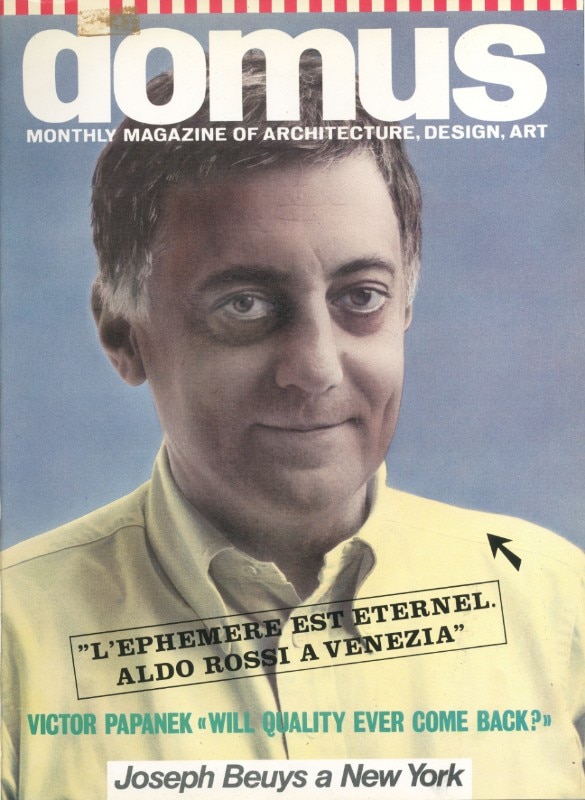Domus presented the Teatro del Mondo or Venetian Theatre – a floating structure designed by Aldo Rossi in 1979 for the 1980 Venice Biennale – in issue 602 (January 1980). It was the first with Alessandro Mendini at the helm and from graphic design to editorial content it marked a radical shift for the magazine that Gio Ponti had handed over to the young Milanese architect a few months earlier. The contents changed but, crucially, so did the form of communication – starting with the cover which showed the faces of those featured in the issue for the first time. In that case, it was Aldo Rossi in an Occhiomagico portrait on which Emilie van Hees had used acid to produce unrealistic colours. Superimposed diagonally across Rossi’s lemon shirt was a teaser of the title of the mini-essay written for the occasion by the historian Manfredo Tafuri: L’ephemere est eternel.
