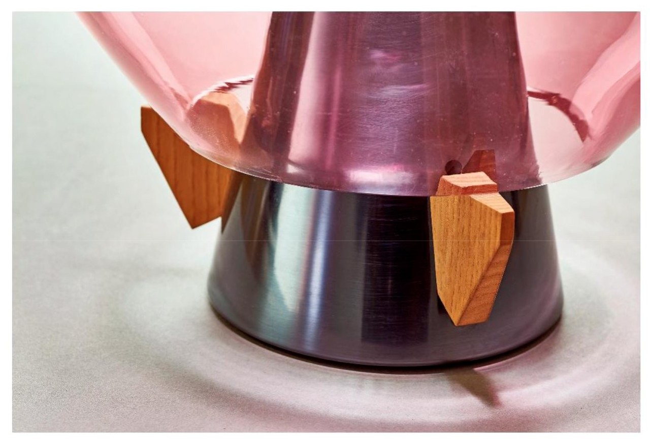 “I believe, too, that my lamps really need colour. If their transparency is not brightened, their formal richness cannot be appreciated. I would have liked to have gone even farther in this direction, to add colours and an inner blue or yellow core. But somehow the seriality of kiln glassmaking prevented any further experimentation on my part. Maybe that is why I was not allowed to enter the kiln during processing, for fear that I might have impeded it or wasted precious time. The glass-blowers were strong men, who needed a great deal of breath to blow such a mass of material. They were the most sought-after and hence also the most expensive. The beautiful shade of watered wine of which I am so fond came from adding the right measure of gold dust. The green is a pale bottle green, specially blanched to create easier serial reproduction. The amber colour is the only one still in production, I believe precisely for these reasons of large-scale manufacturing.”
