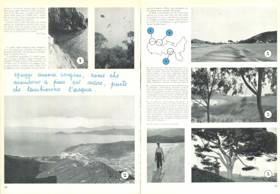 In 1940 Gio Ponti presented a study by BBPR – with Rogers forced out of visibility by Italian racial laws – to enhance Elba as the tourist pearl of a future Italy (Domus 152, August 1940). Once realistically assessed the historical context of an Italy that still found itself officially indulging in a delirium of expansionist grandeur, as it was instead embarking on the final descent of its darkest two decades, going through the BBPR study reveals an intimately and enthusiastically modern research project, bristling with data and schemes: it actually deploys visual devices such as scale comparisons, collages and infographics – of fish, coastlines and rocks – that years later would meet a great fortune; It tells of a planned and plannable Elba where some new, rationalist settlements, such as the one at the Gulf of Biodola, find their place alongside strategy and infrastructure projects.