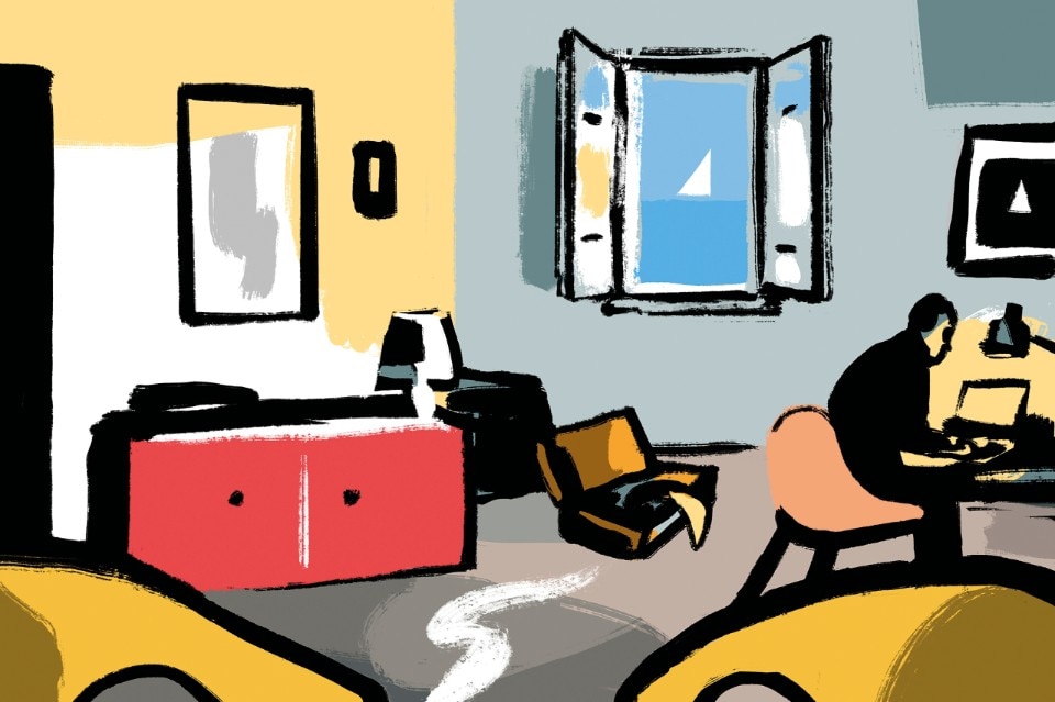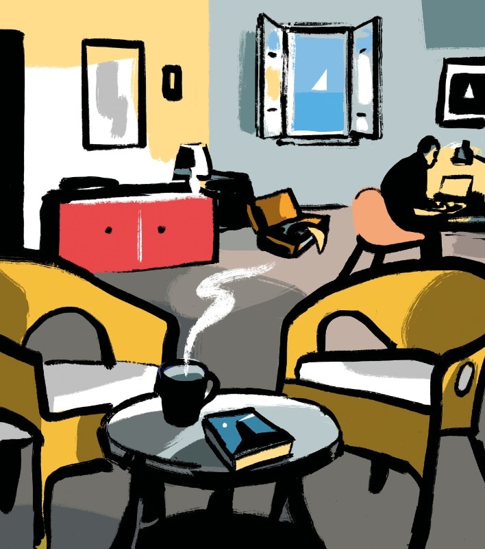 The apartment was little more than a large room, but everything about it made it feel like a house. A grey fitted carpet and an L-shaped layout made you think there were two rooms: a living area and, around the corner, a sleeping area. In practice, this translated into a bed and a bedside table on one side, and a desk and chair on the other. Two wicker chairs and a coffee table delimited a sort of imaginary lounge. On the cover of a book on the table was the lighthouse, which I couldn’t see from my window. I’ve never found out who lived in the apartment when I wasn’t there, but all they possessed was locked up in a wardrobe. All my belongings, instead, remained in my suitcase beside the bed or were scattered around the room and in the windowless bathroom.