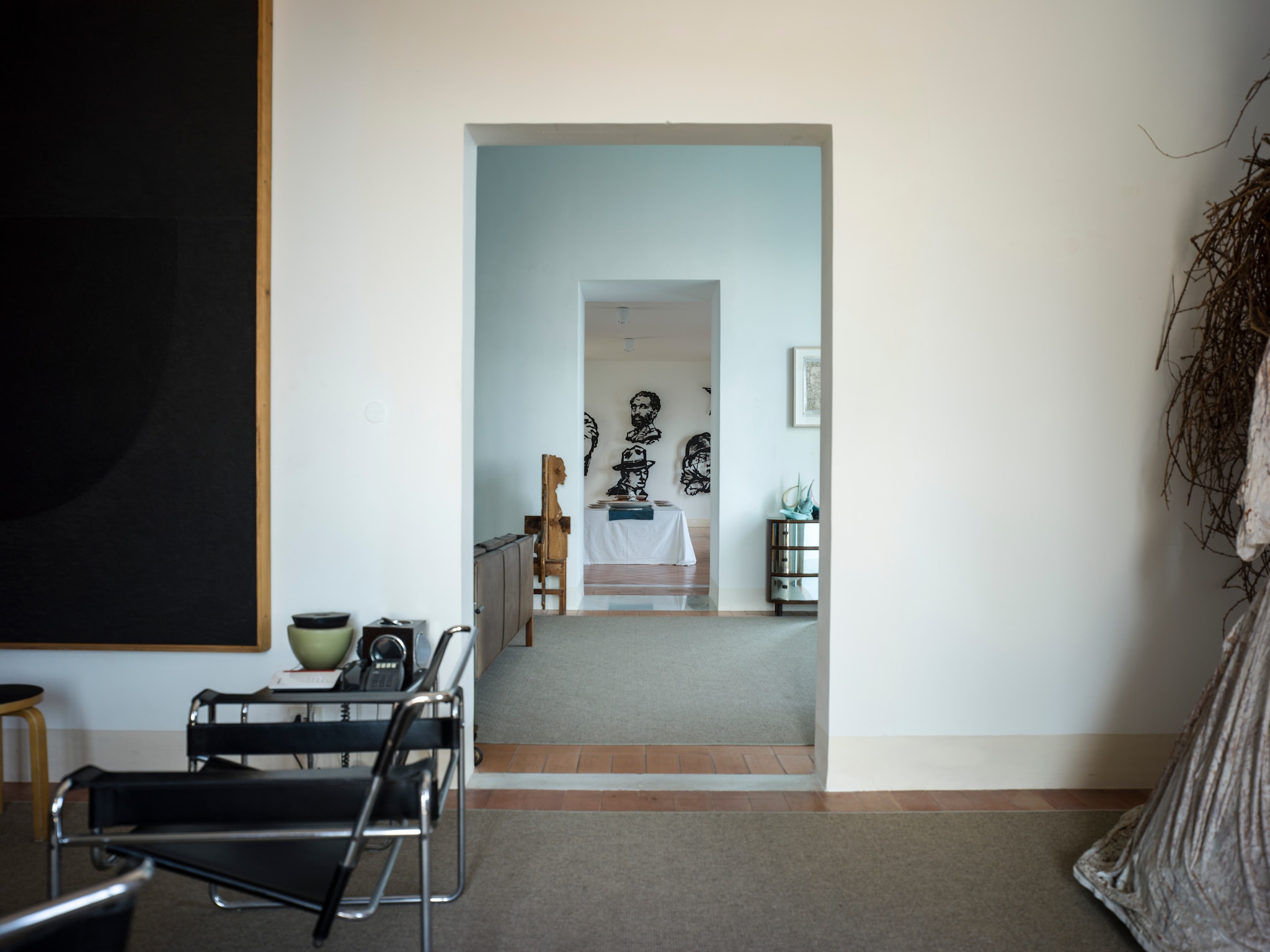 The large dining room has a table that is 8 metres long and can seat more than 30 people; “it reminds me of my childhood with my family, we were many and always cheerful at lunch and dinner-time; we had interesting conversations”. Now the table here is always set with a white tablecloth and shiny silks as well as the unmissable ceramic candelabras by Ugo Marano and other objects in the same material by Nunzio Vitale. The back wall frames the perspective of a series of human faces with outlines drawn in black, as well as a hen: this is the work of William Kentridge on faces: Head - Man with Beard, 2017; Small Silhouette (Bird) Variation, 2016; Head (Miner), 2016 and Head (Man with Hat), 2017. A marble frame marks the perimeter of the floor of this room, highlighting even more the caramel-coloured brick in contrast to the large black leather star, hanging on the wall – Leather Star on Javelins (Stella di cuoio su giavellotti) from 2007, by Gilberto Zorio.