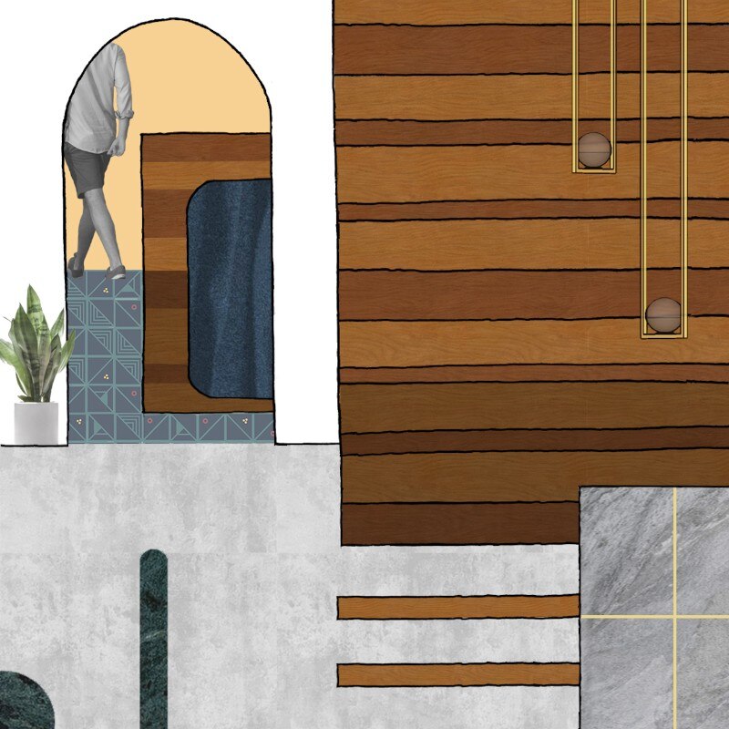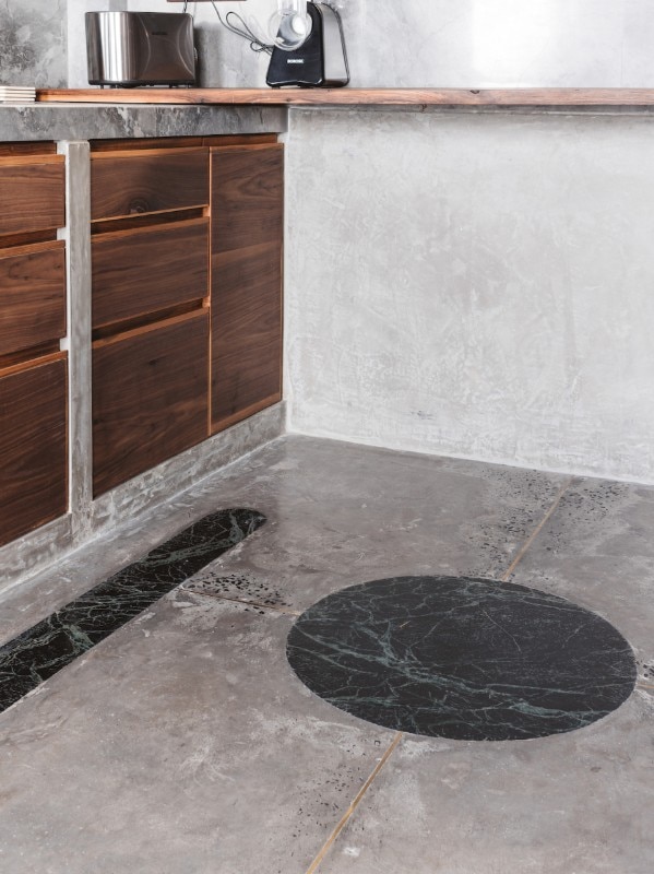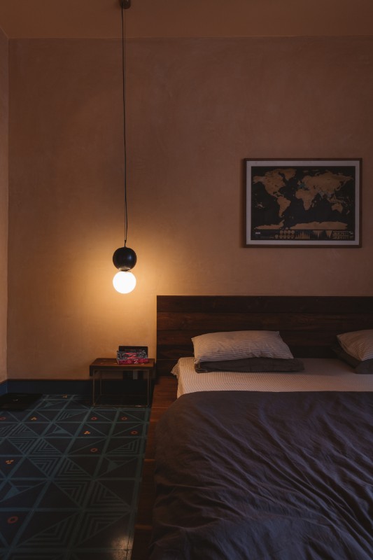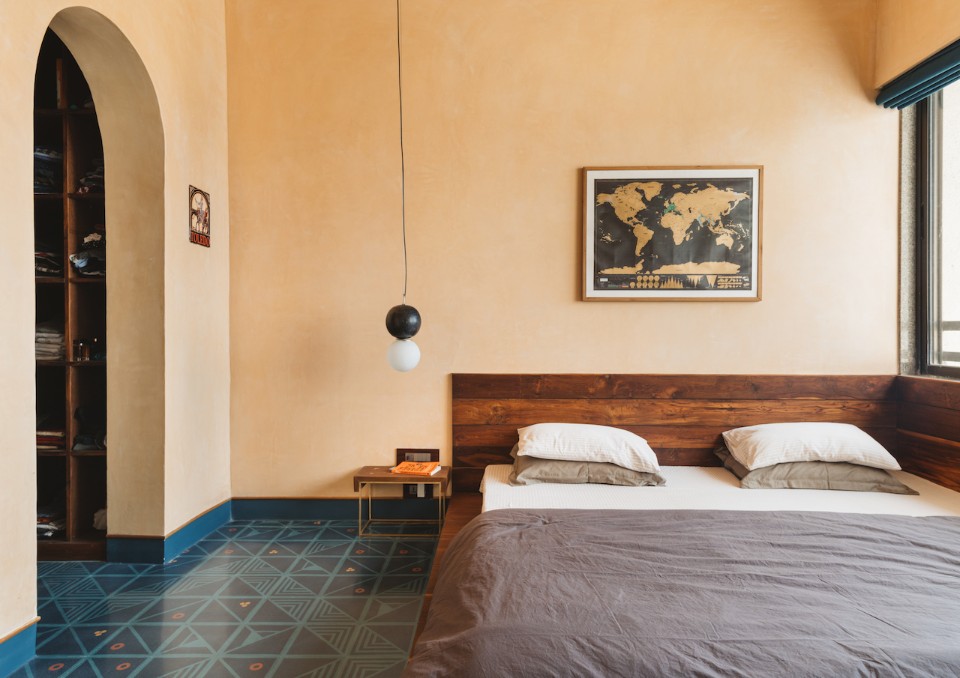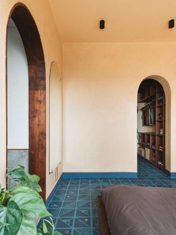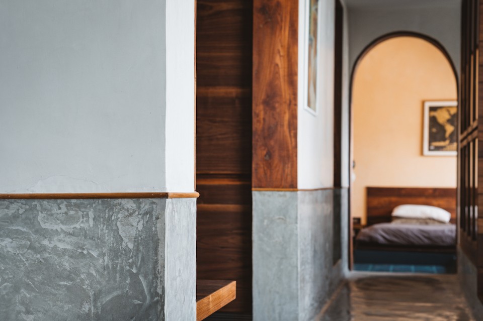 The dining table in grey polished marble converges into the relax and reading room, a retreat-like space entirely cladded in wood where people can retire by stepping on a little stair. On the floor, polished concrete is completed with different inlays, like wood, stone, cement tiles and brass, creating a patchwork of materials and combinations of textures. The last part hosts a blue-tone-floor bedroom provided with wardrobe. The apartment creates the feeling of a vernacular cottage in the middle of the city. Arches and shades of indigo and turquoise complete the space.