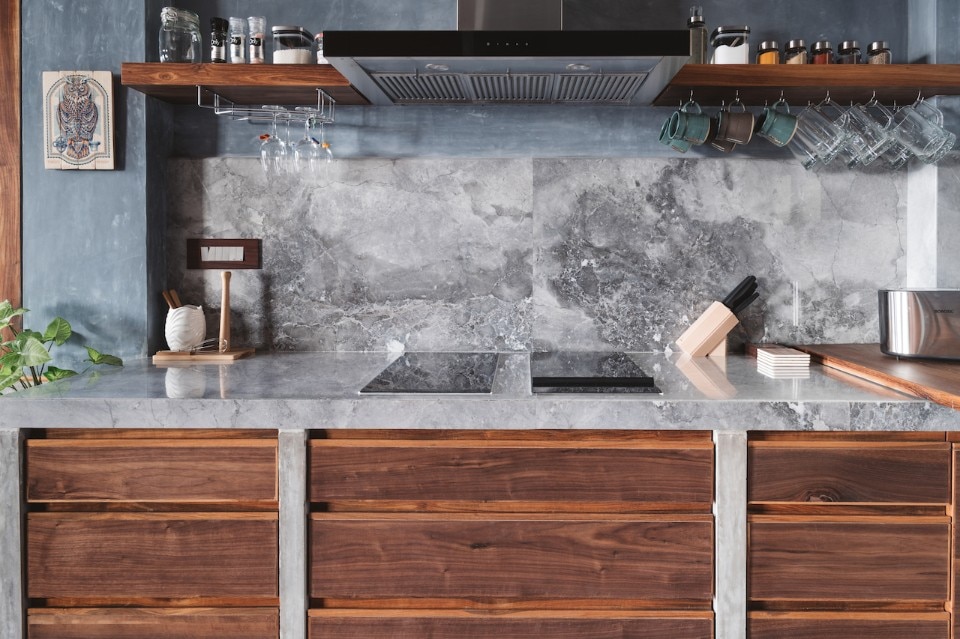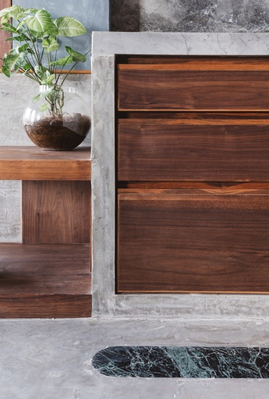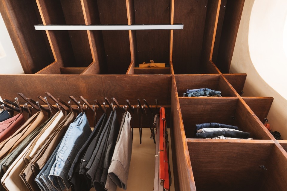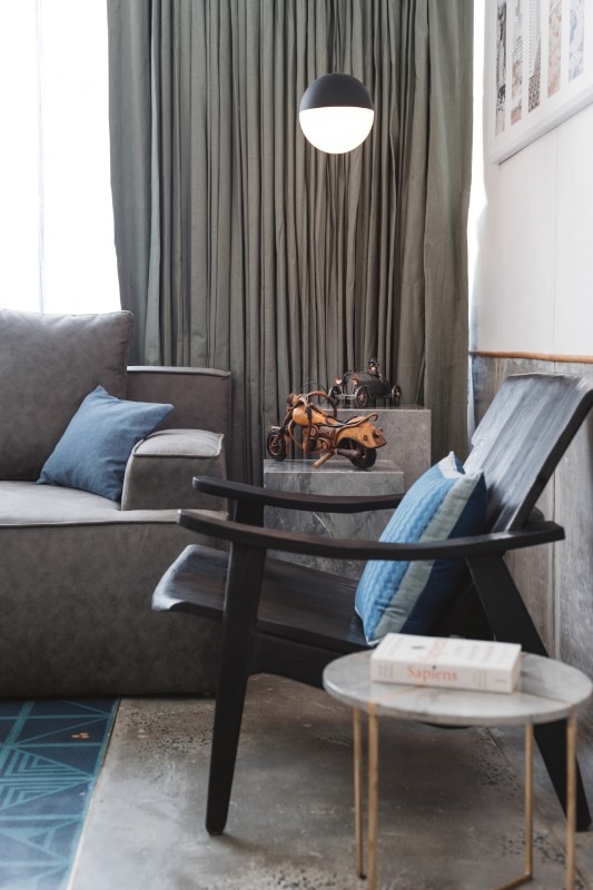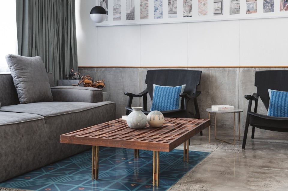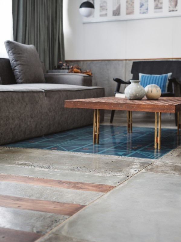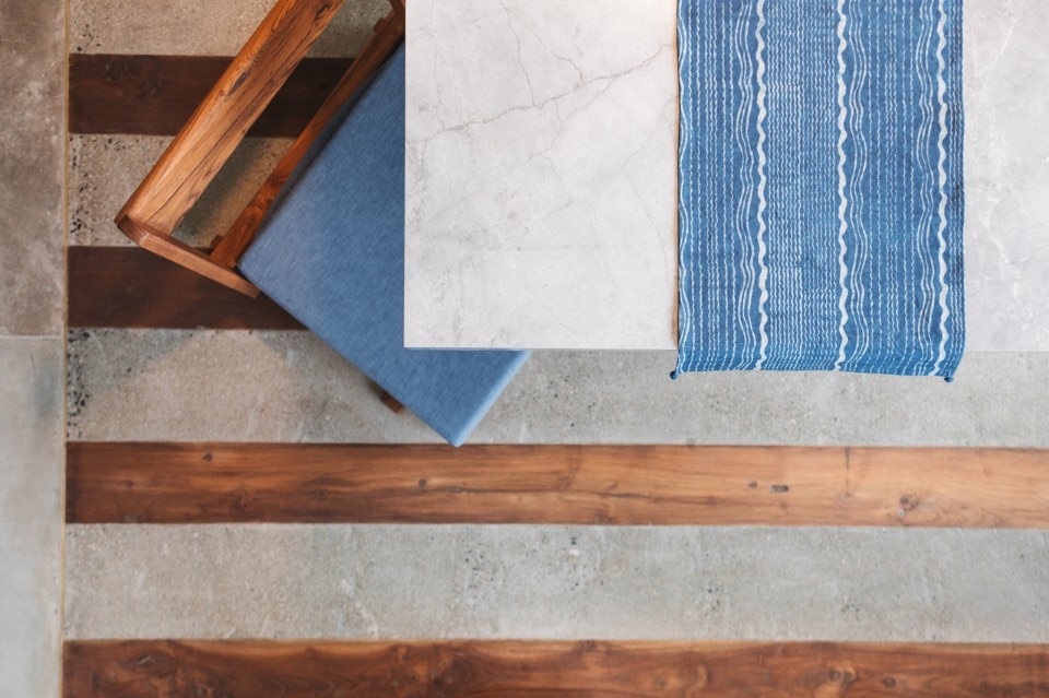 The dining table in grey polished marble converges into the relax and reading room, a retreat-like space entirely cladded in wood where people can retire by stepping on a little stair. On the floor, polished concrete is completed with different inlays, like wood, stone, cement tiles and brass, creating a patchwork of materials and combinations of textures. The last part hosts a blue-tone-floor bedroom provided with wardrobe. The apartment creates the feeling of a vernacular cottage in the middle of the city. Arches and shades of indigo and turquoise complete the space.