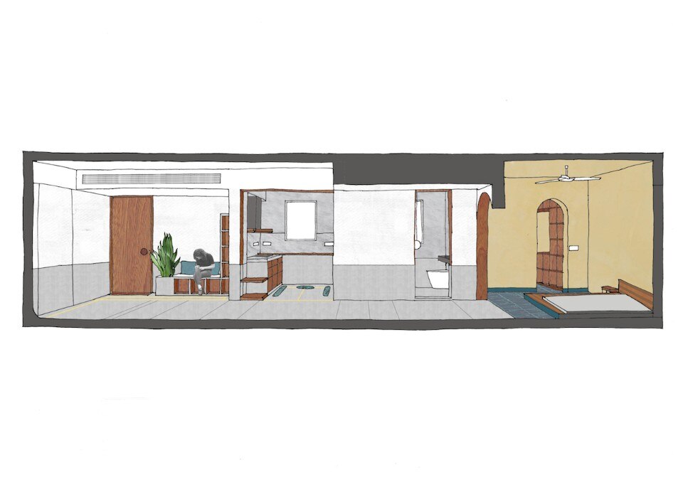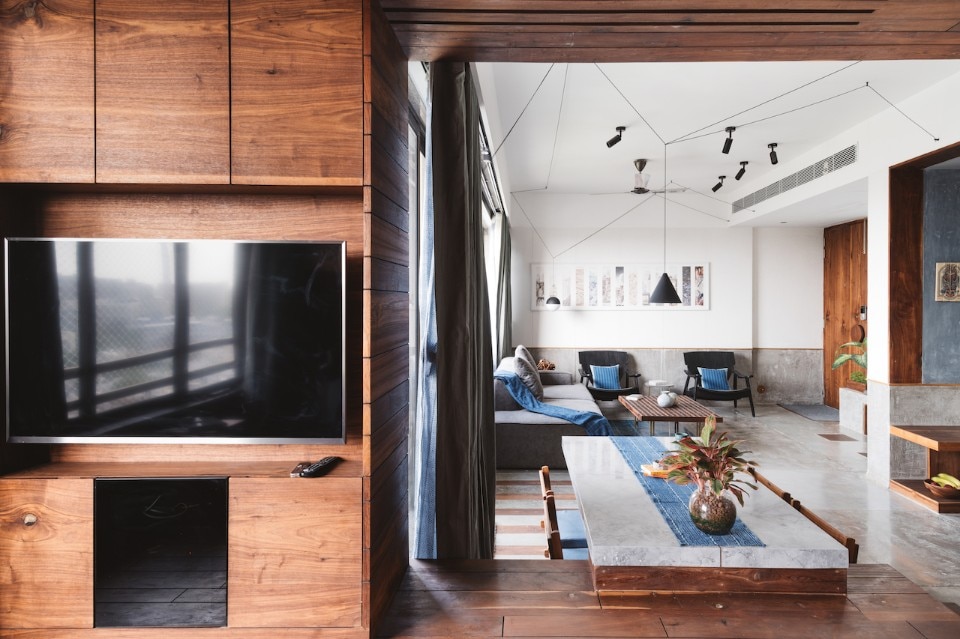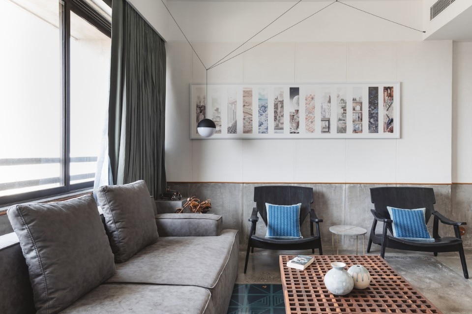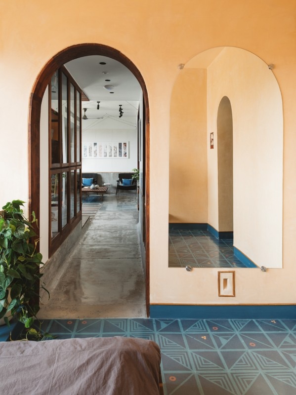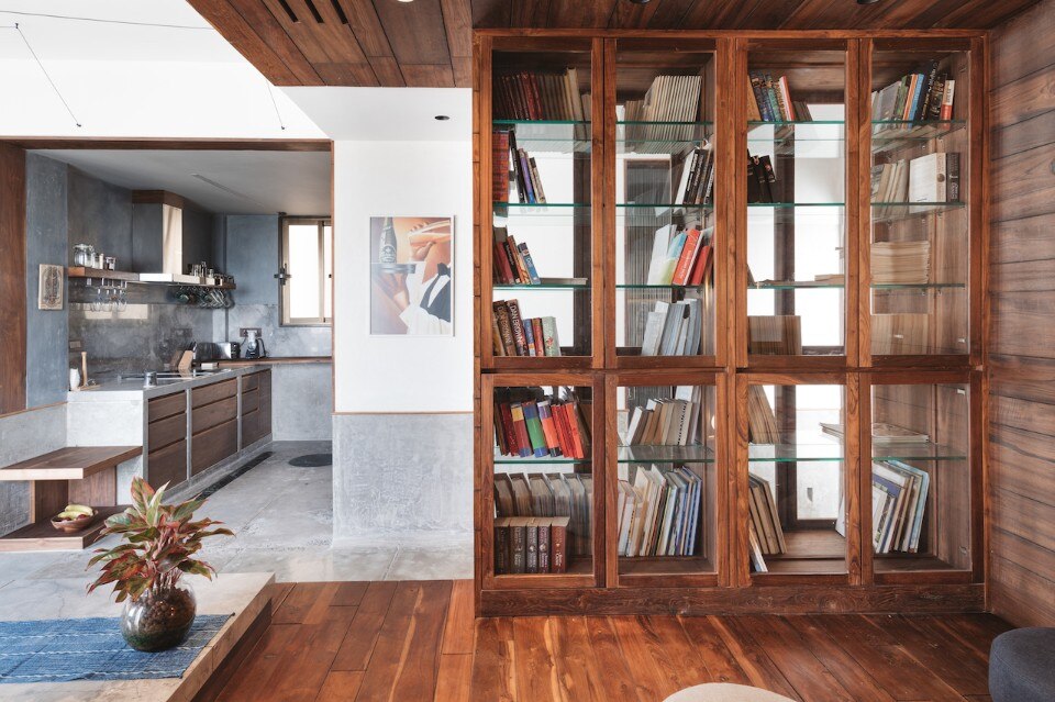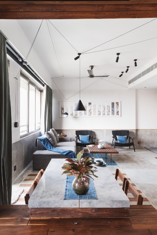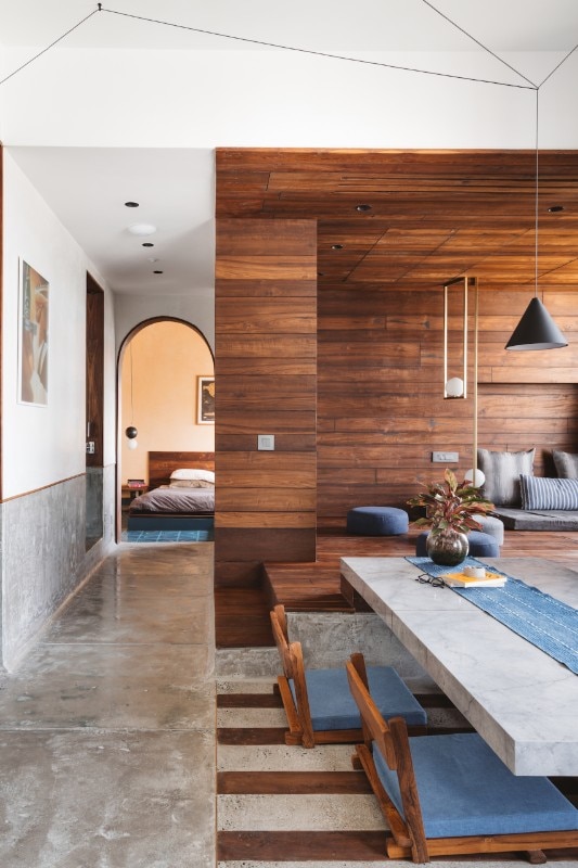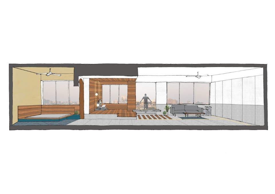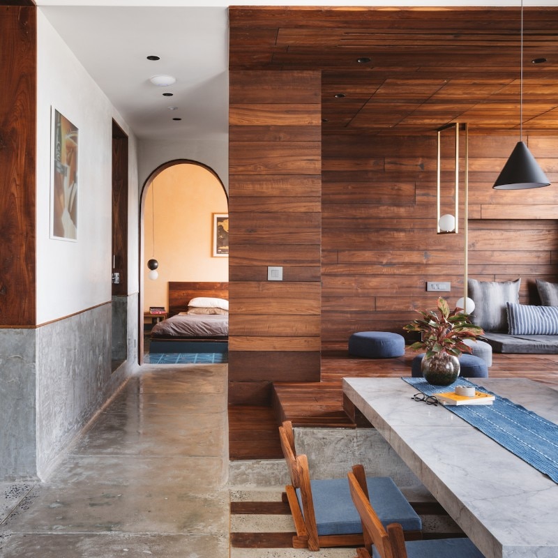 MD Apartment in Ahmedabad, India, is a designer’s studio made by Malay Doshi, Arihant Bajaj and Tejashree Karande. The previous space was restored demolishing the existing partitions, the original bathroom, kitchen and floor to create an open space where communal areas and private spots are mixed, always maintaining a visual connection and openness. The project also aims to make a smart use of the space by providing niches and distributing rooms on different heights.
