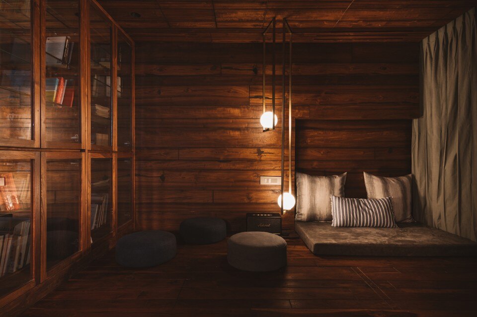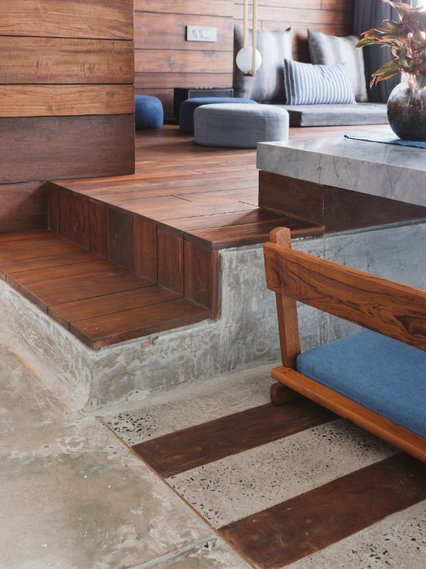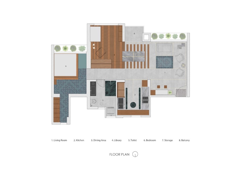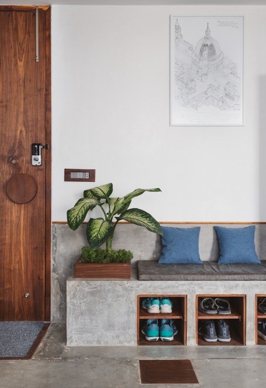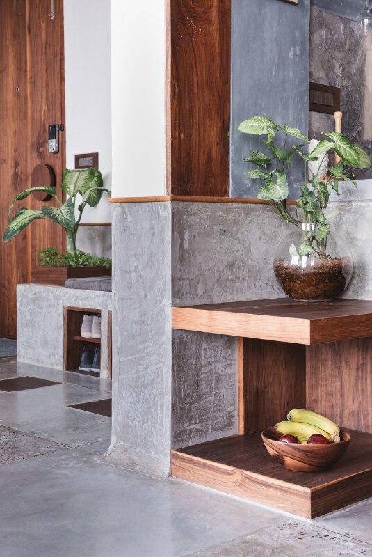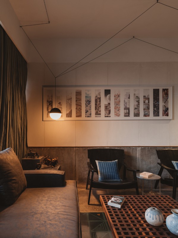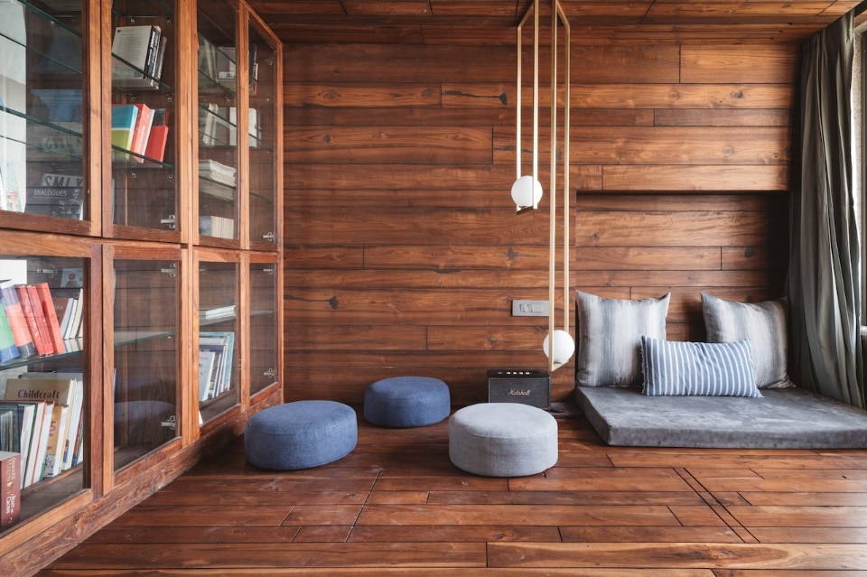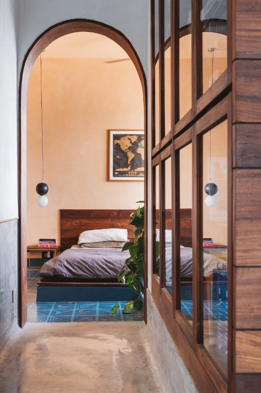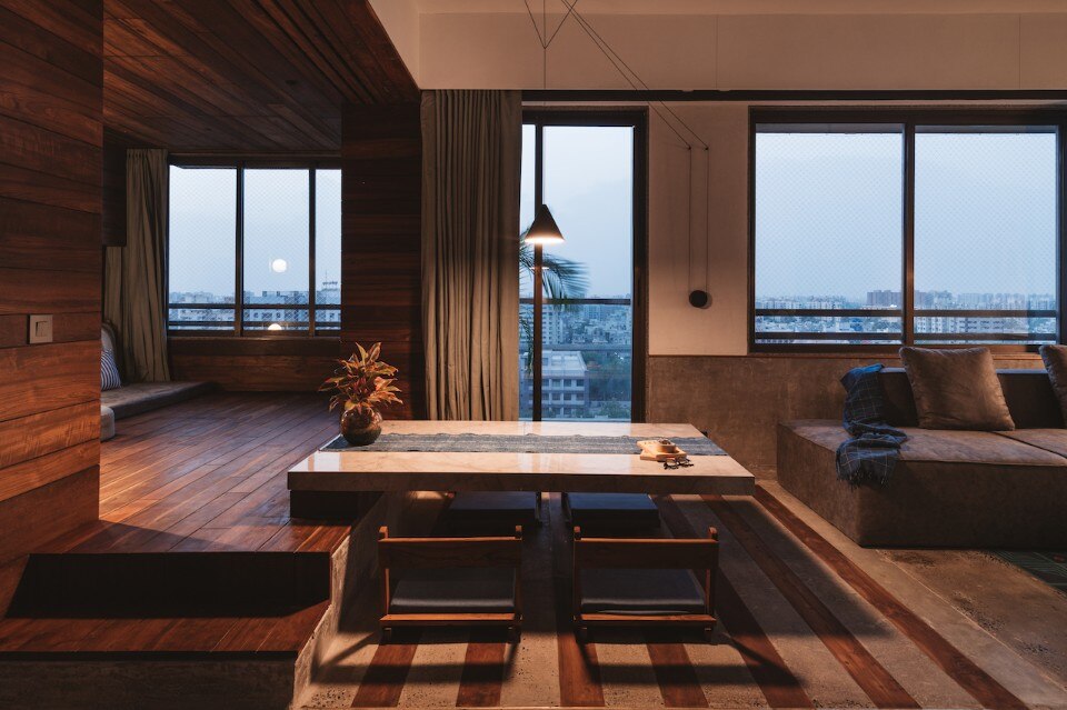 MD Apartment in Ahmedabad, India, is a designer’s studio made by Malay Doshi, Arihant Bajaj and Tejashree Karande. The previous space was restored demolishing the existing partitions, the original bathroom, kitchen and floor to create an open space where communal areas and private spots are mixed, always maintaining a visual connection and openness. The project also aims to make a smart use of the space by providing niches and distributing rooms on different heights.