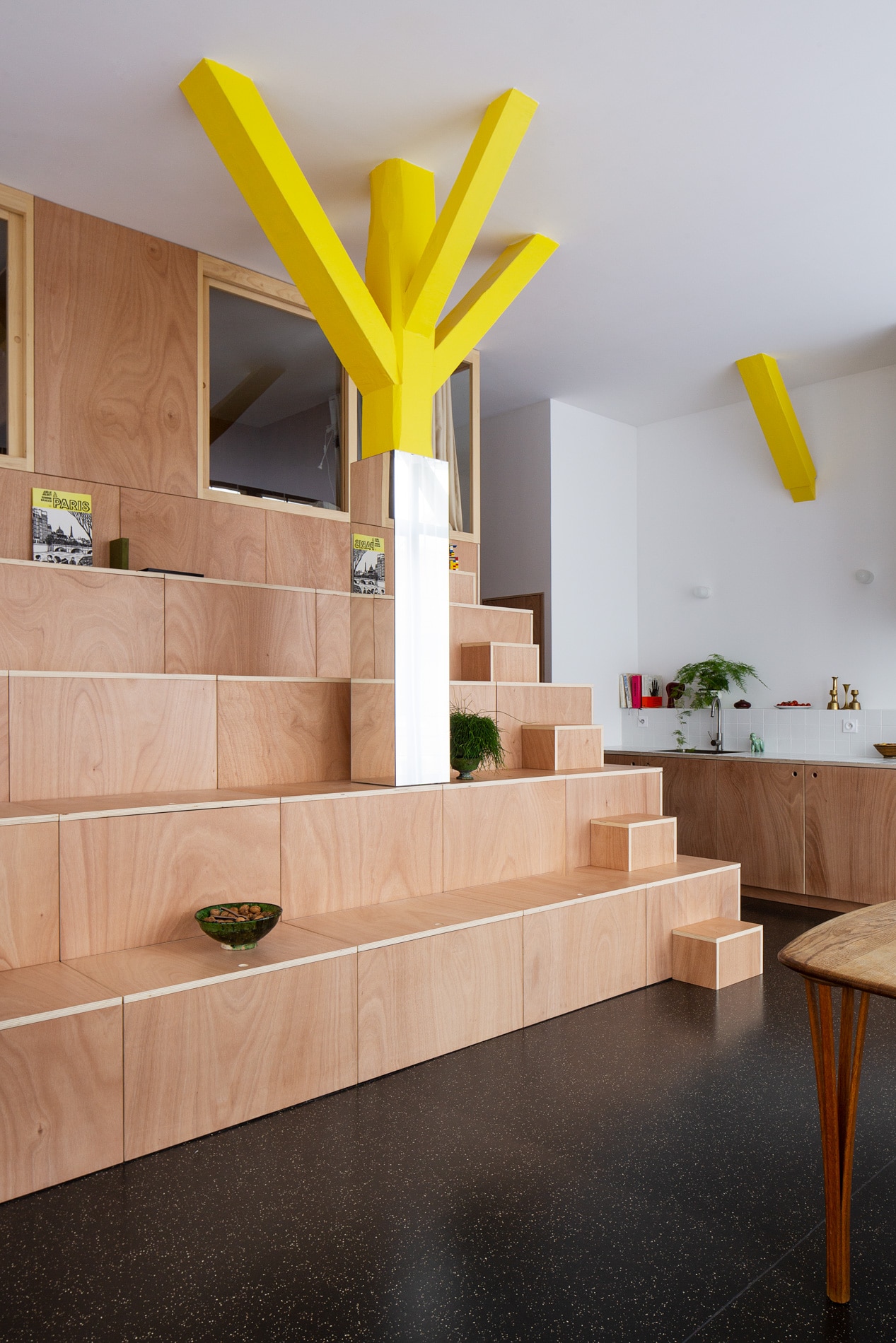 Jean Benoît Vétillard Architecture has transformed a 60 square metre house in Montrouge, France. The design of the BDD Apartment focuses on creating surfaces that define spaces without the presence of walls, adding a new open and usable landscape to the environment. It is a wooden sculpture-structure provided with a staircase that organizes the space inviting to explore it. The first level hides a bedroom and a bathroom just behind the new block that, with its steps overlooking the living and the kitchen, becomes an added area to be experienced. Two bedrooms, one next to the other, are located at the top, closed by sliding glass panels and enlighted by the living room window. The staircase also serves as a container and wardrobe since the side and under-stairs spaces can be used. The apartment is completed by the presence of the yellow to underline supporting elements and by a mirror enclosing the column around which the structure is built.
