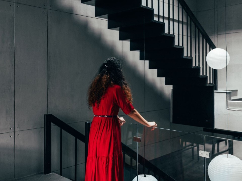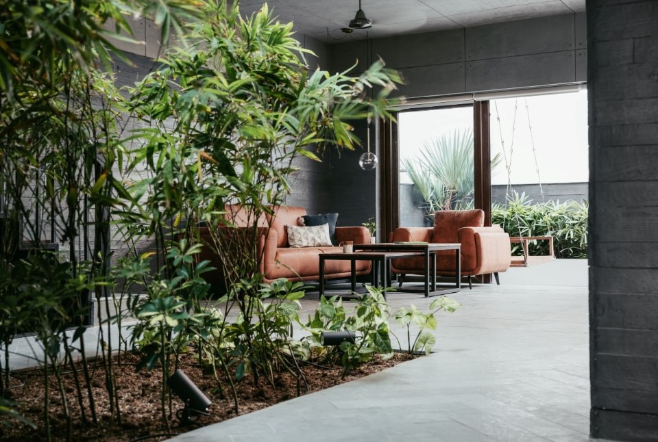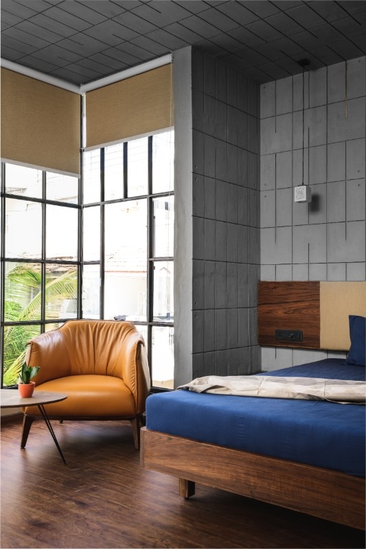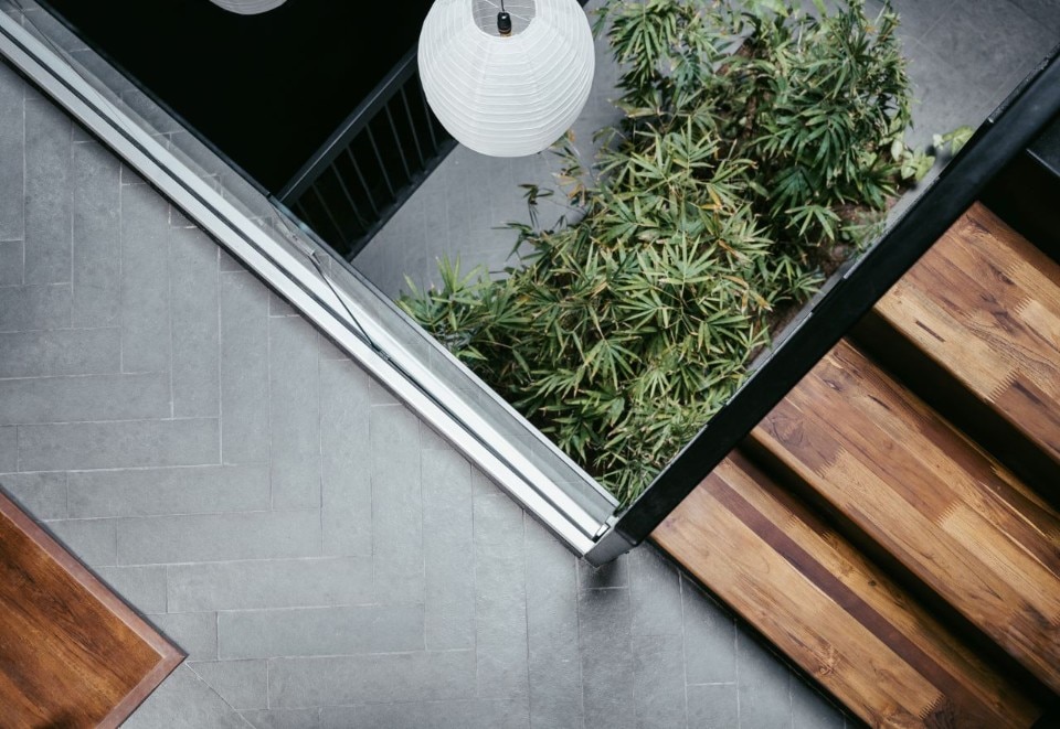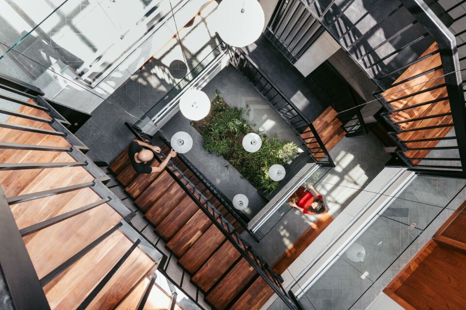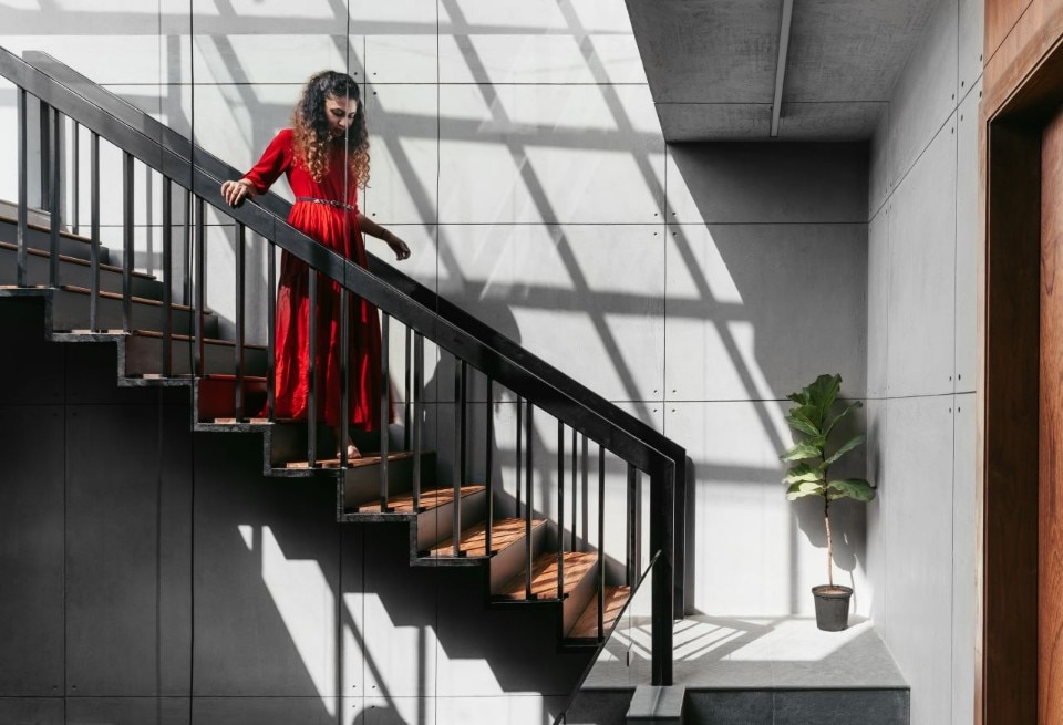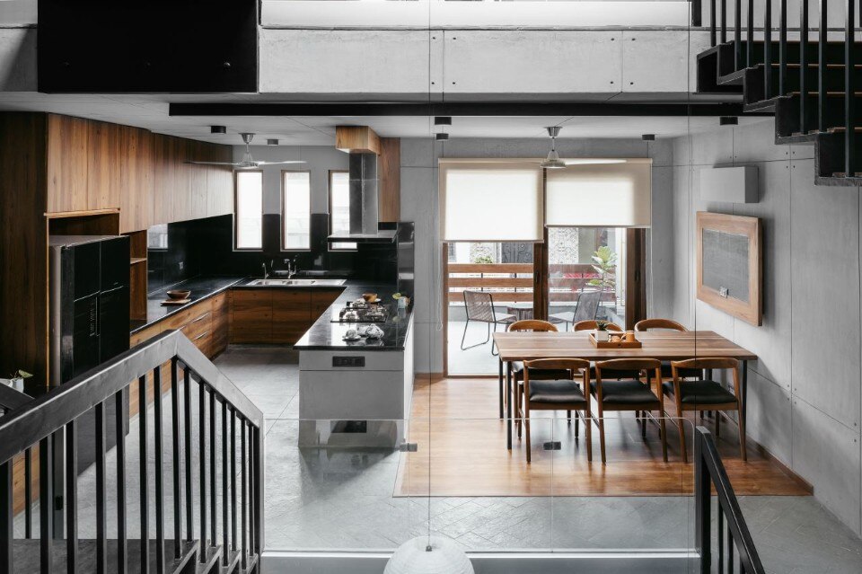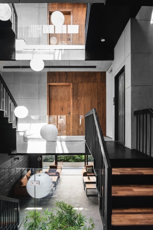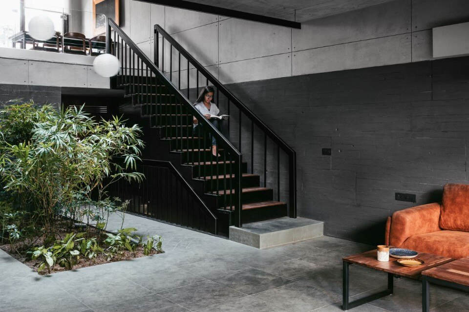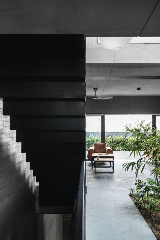 Interiors on the first level are wrapped in dark concrete cladding made from a cast of wooden strips, but HS House also plays with with Kota stone on the floor and metallic and wooden inserts on the staircase and doors.