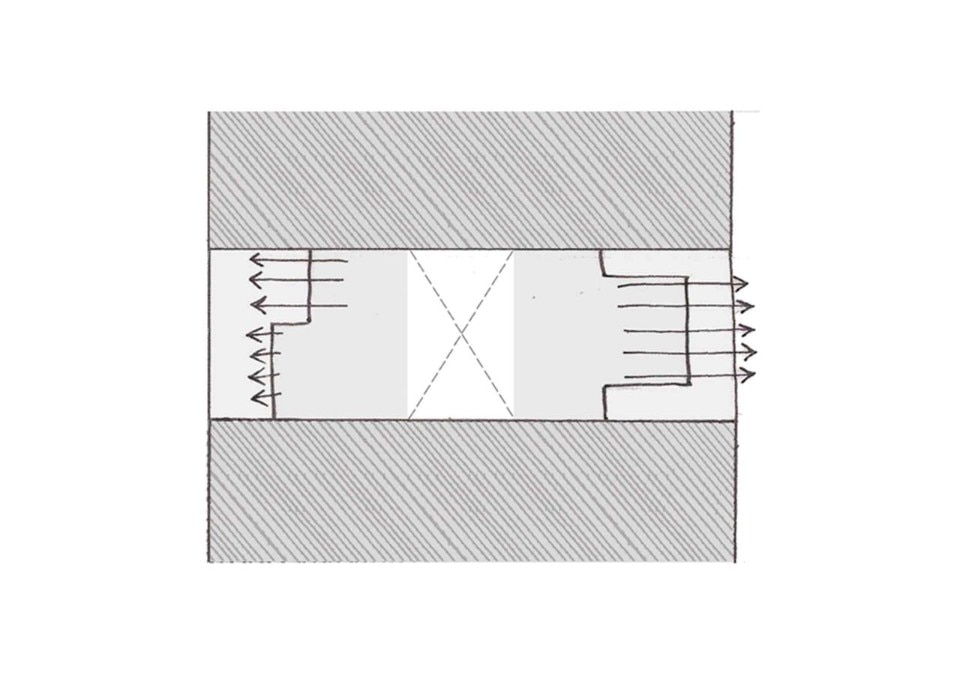This central void includes a mini garden on the ground floor and a glazed volume serving as a skylight on the top floor that is also a wind catcher. The house is made of separate, staggered levels, connected by a metal staircase: the rooms – living, kitchen and bedrooms – are at different heights and some of them are provided with terraces and outdoor spaces.