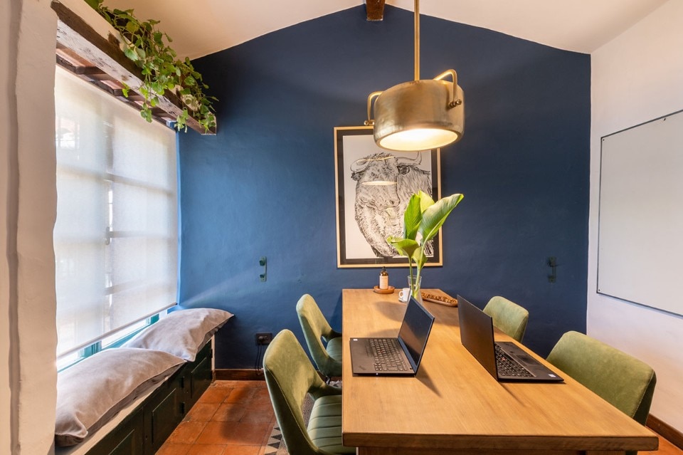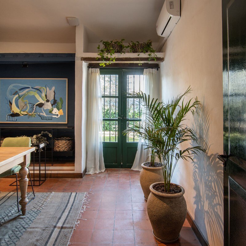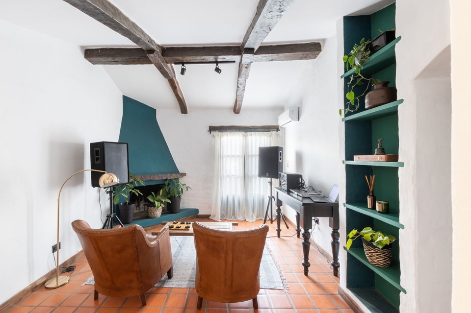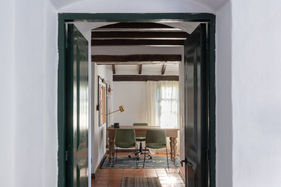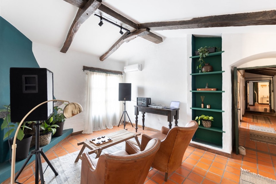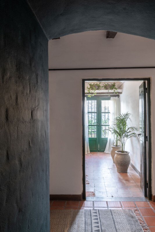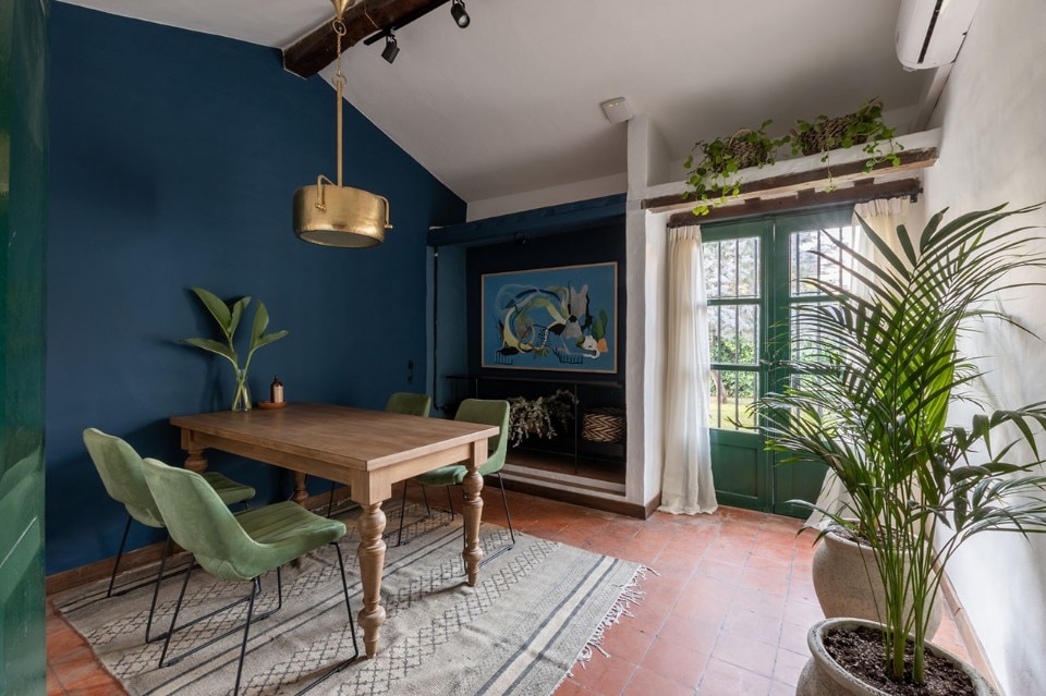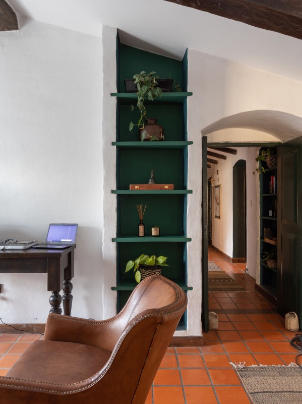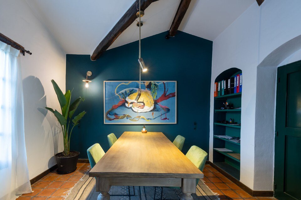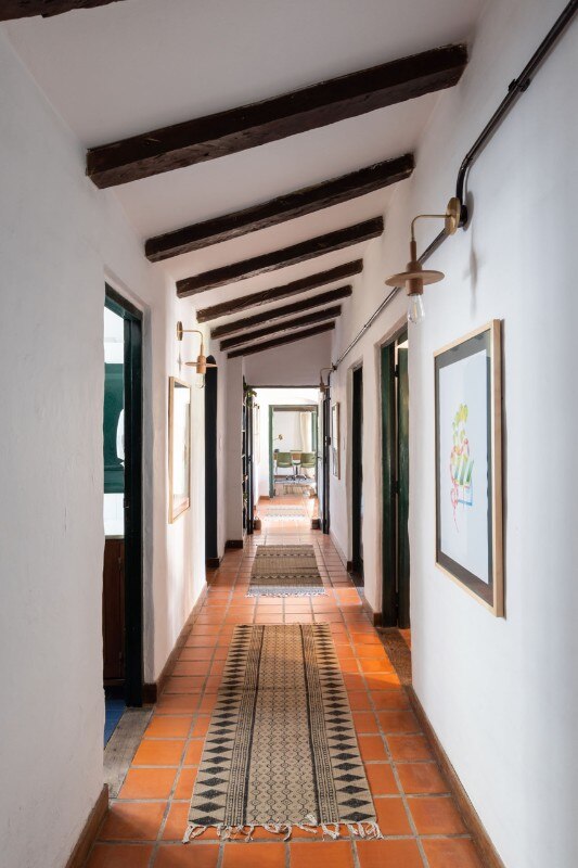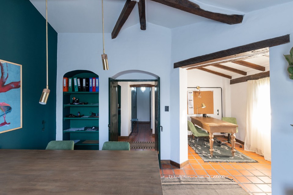 Dominated by the noble materials of terracotta and old wooden beams and crossed by the light coming from the many windows facing the garden, the interiors find a further bond to the outdoor via chromatic inserts in green and blue on walls and niches. Distributed in succession, the rooms cancel any hierarchical arrangement of roles, in favor of a flexible and horizontal organization of tasks.