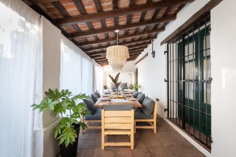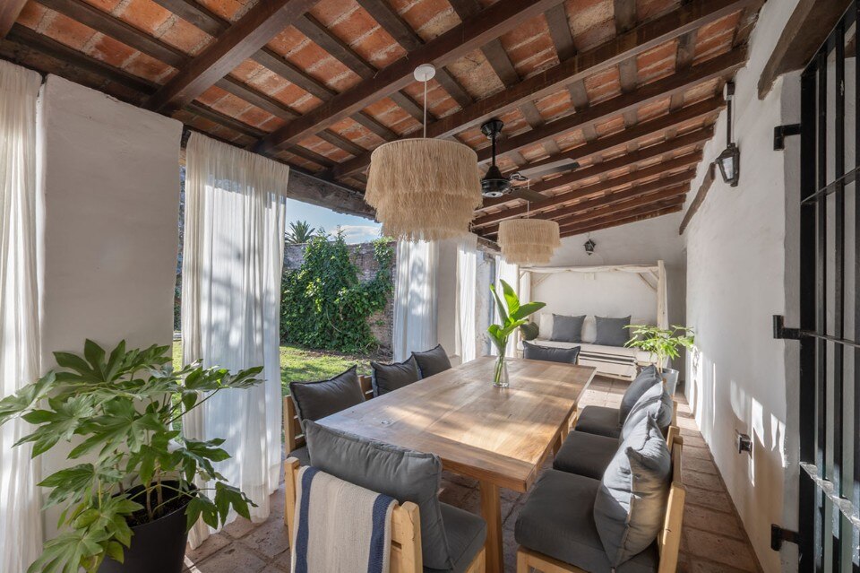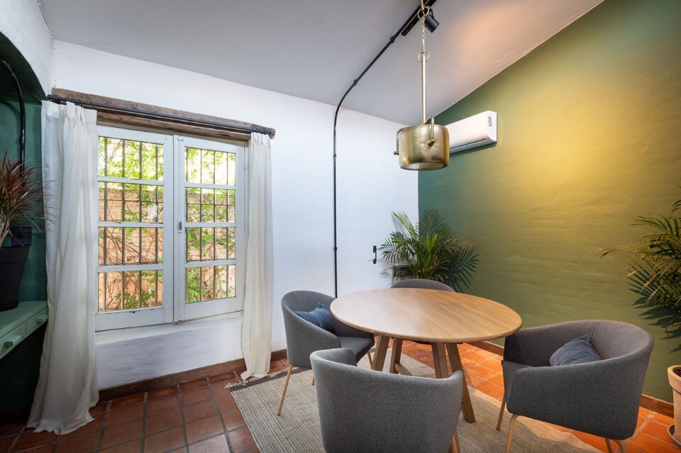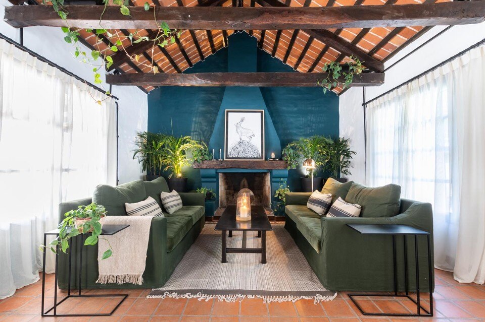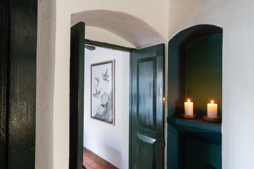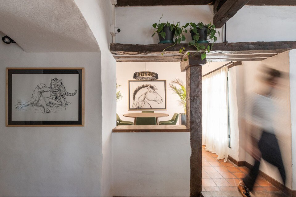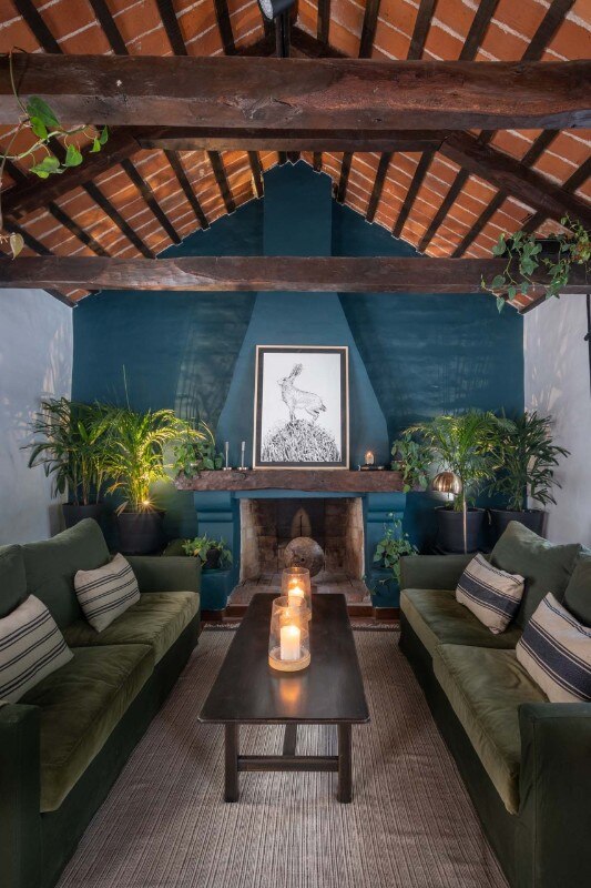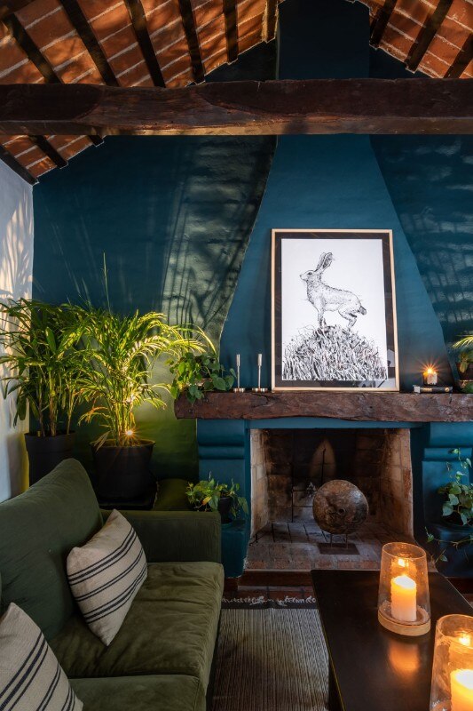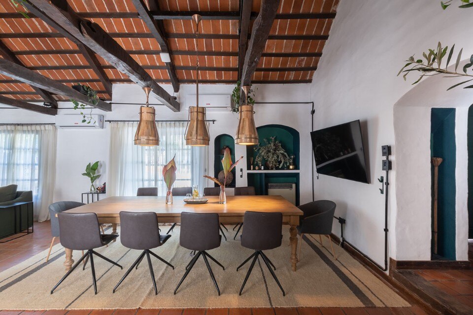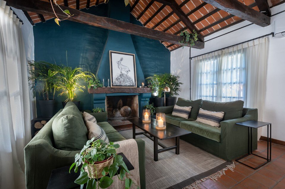 Dominated by the noble materials of terracotta and old wooden beams and crossed by the light coming from the many windows facing the garden, the interiors find a further bond to the outdoor via chromatic inserts in green and blue on walls and niches. Distributed in succession, the rooms cancel any hierarchical arrangement of roles, in favor of a flexible and horizontal organization of tasks.