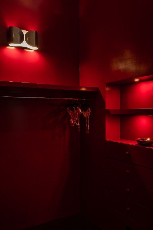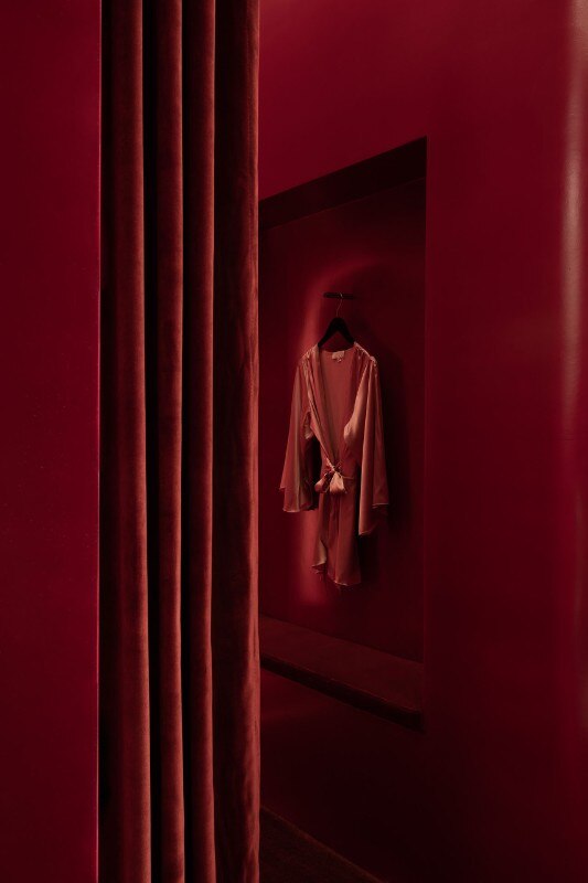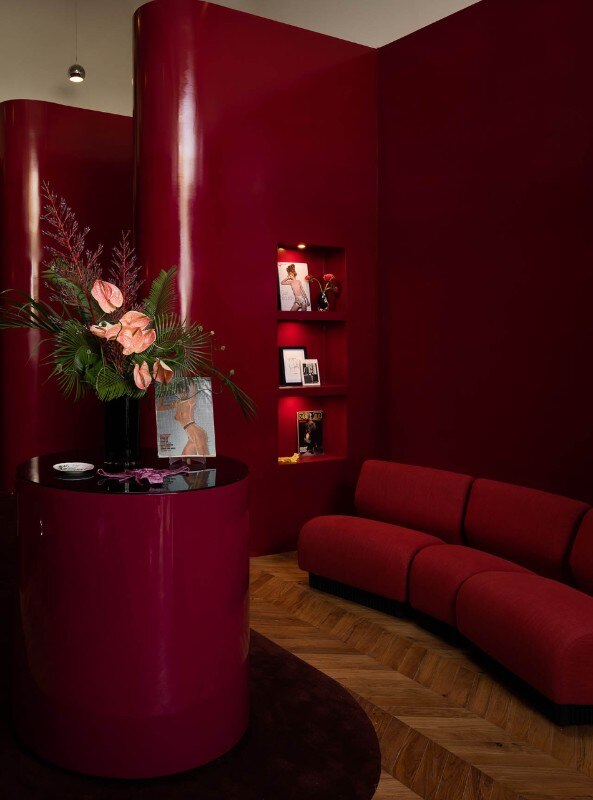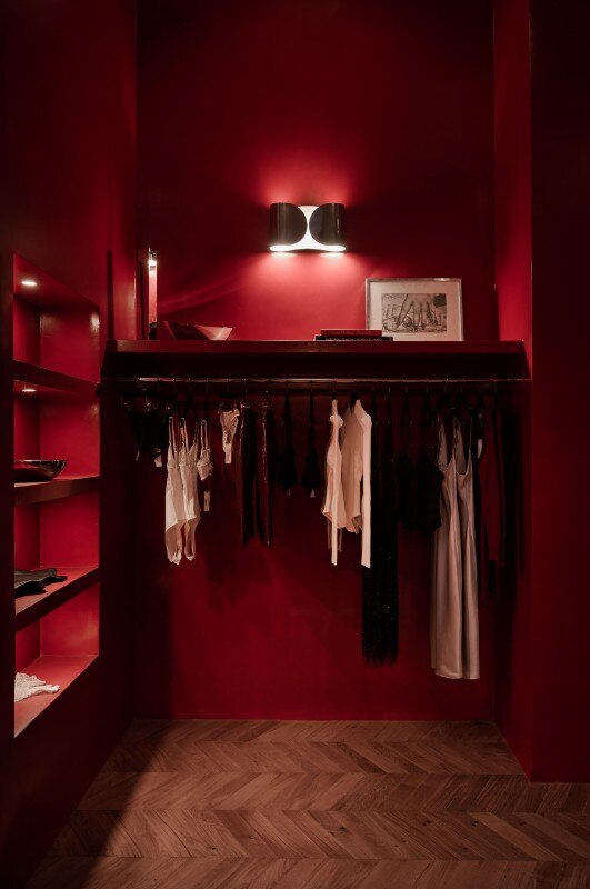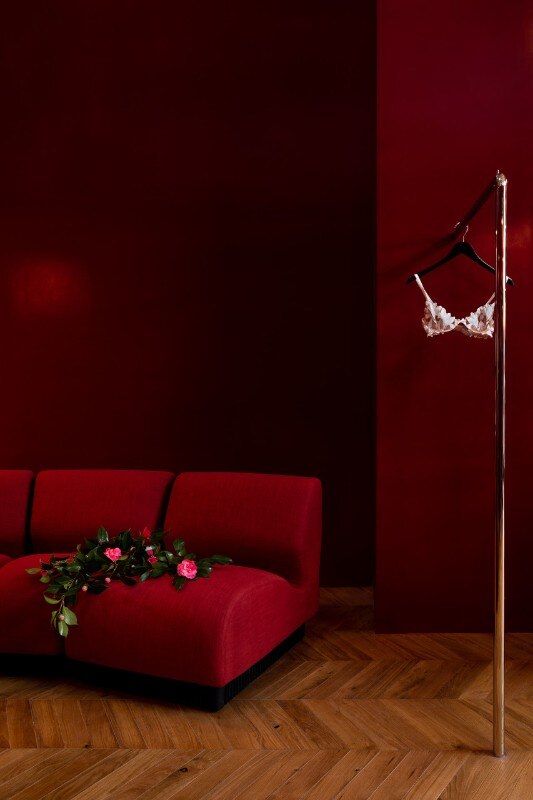 Combining bourgeois stylistic elements - the herringbone parquet floor, the Foglio lamp by Tobia Scarpa for Flos - with the fluidity of the organic forms of the sofas, wings and counter, the space avoids any hyperdecorative winks and chooses to privilege rounded forms and an unmistakable red color on the walls. An expedient that allows sensuality to explode without vulgarity, not concealing the nature of the store but keeping it safe from maximalist drifts. In this niche dominated by red, even the product remains discreet: without flooding the displays, it prefers to muse within niches and stands, using subtraction as a strategy to emphasize its effortless protagonism.